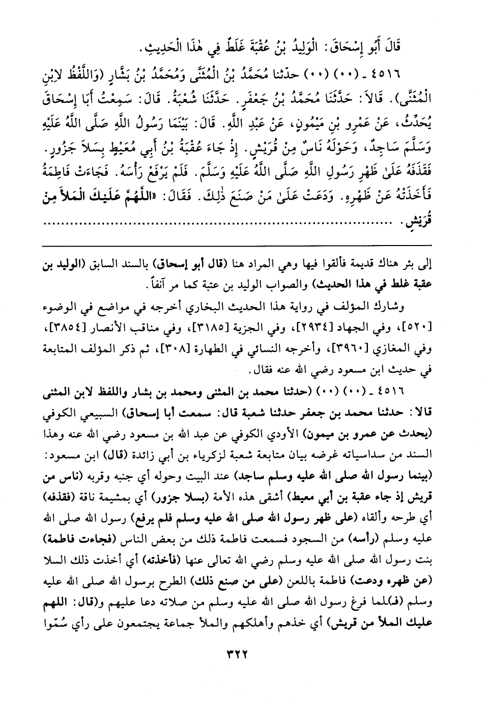 ٤٥١٦ - (٠٠) (٠٠) حَدَّثَنَا مُحَمَّدُ بْنُ الْمُثَنَّى وَمُحَمَّدُ بْنُ بَشَّارٍ (وَاللَّفْظُ لا بْنِ الْمُثَنَّى) قَالا: حَدَّثَنَا مُحَمَّدُ بْنُ جَعْفَرٍ. حَدَّثَنَا شُعْبَةُ. قَال: سَمِعْتُ أَبَا إِسْحَاقَ يُحَدِّثُ, عَنْ عَمْرِو بْنِ مَيمُونٍ، عَنْ عَبْدِ اللَّهِ، قَال: بَينَمَا رَسُولُ اللهِ صلى الله عليه وسلم سَاجِدٌ, وَحَوْلَهُ نَاسٌ مِنْ قُرَيشٍ. إِذْ جَاءَ عُقْبَةُ بْنُ أَبِي مُعَيطٍ بِسَلا جَزُورٍ. فَقَذَفَهُ عَلَى ظَهْرِ رَسُولِ اللَّهِ صلى الله عليه وسلم. فَلَمْ يَرْفَعْ رَأْسَهُ. فَجَاءَتْ فَاطِمَةُ فَأَخَذَتْهُ عَنْ ظَهْرِهِ. وَدَعَتْ عَلَى مَنْ صَنَعَ ذَلِكَ. فَقَال: "اللَّهُمَّ عَلَيكَ الْمَلأَ مِنْ قُرَيشٍ