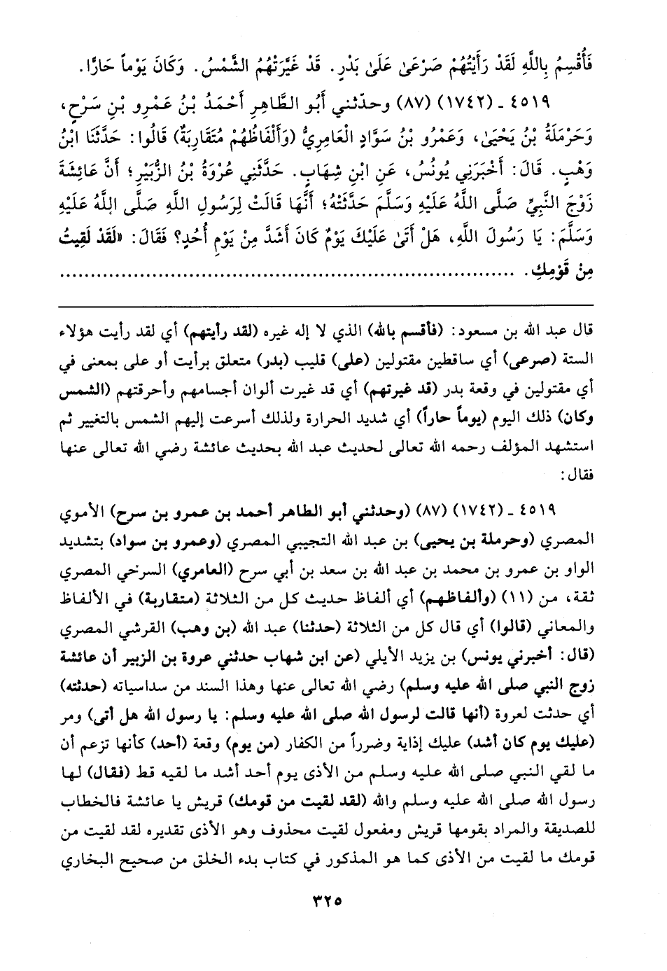 ٤٥١٩ - (١٧٤٢) (٨٧) وَحَدَّثَنِي أَبُو الطَّاهِرِ أَحْمَدُ بْنُ عَمْرِو بْنِ سَرْحٍ, وَحَرْمَلَةُ بْنُ يَحْيَى, وَعَمْرُو بْنُ سَوَّادٍ الْعَامِرِيُّ (وَأَلْفَاظُهُمْ مُتَقَارِبَةٌ) قَالُوا: حَدَّثَنَا ابْنُ وَهْبٍ. قَال: أَخْبَرَنِي يُونُسُ، عَنِ ابْنِ شِهَابٍ. حَدَّثَنِي عُرْوَةُ بْنُ الزُّبَيرِ؛ أَنَّ عَائِشَةَ زَوْجَ النَّبِيِّ صلى الله عليه وسلم حَدَّثَتْهُ؛ أَنَّهَا قَالتْ لِرَسُولِ اللَّهِ صلى الله عليه وسلم: يَا رَسُولَ اللهِ, هَلْ أَتَى عَلَيكَ يَوْمٌ كَانَ أَشَدَّ مِنْ يَوْمِ أُحُدٍ؟ فَقَال: "لَقَدْ لَقِيتُ مِنْ قَوْمِكِ
