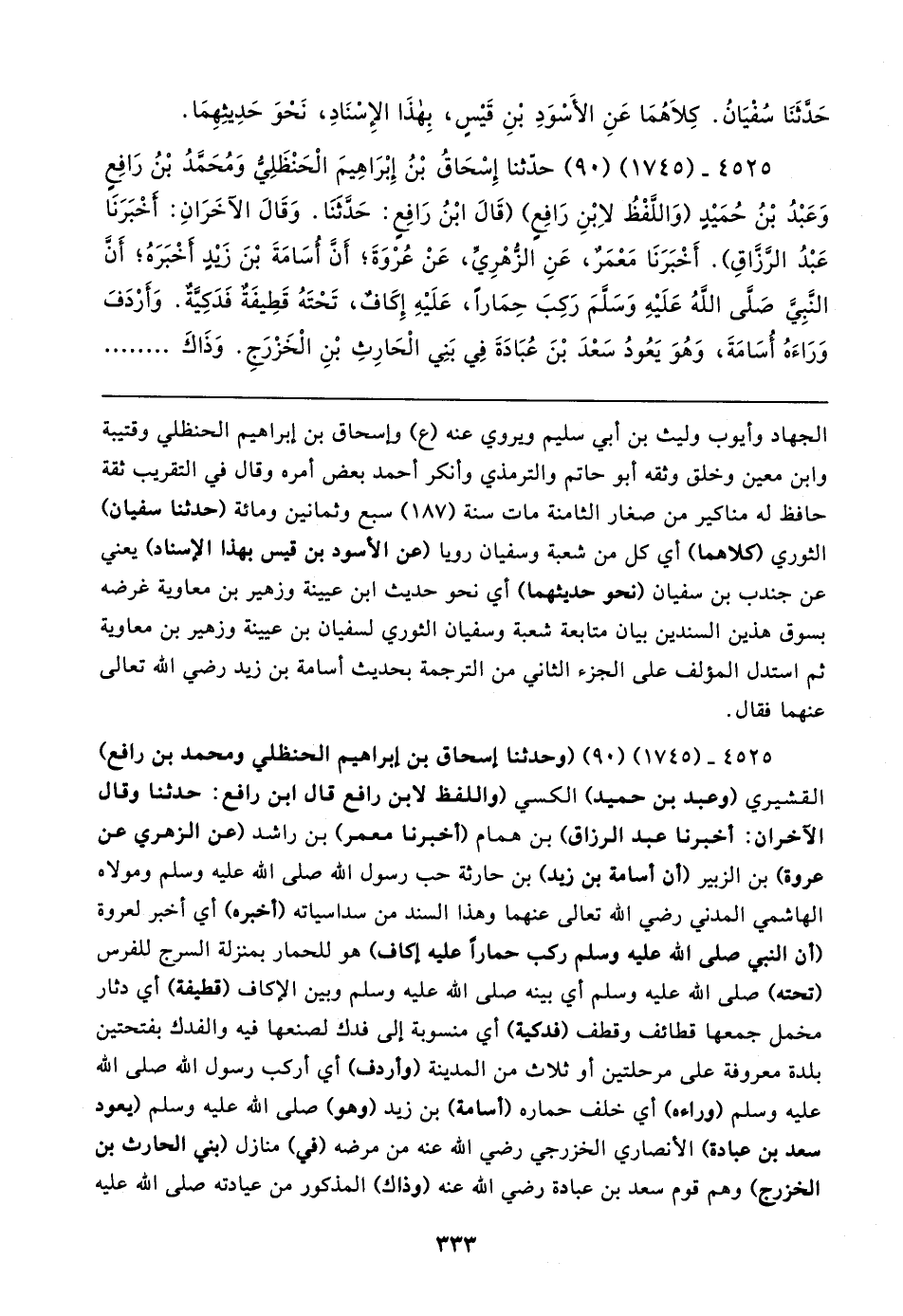 ٤٥٢٥ - (١٧٤٥) (٩٠) حَدَّثَنَا إِسْحَاقُ بْنُ إِبْرَاهِيمَ الْحَنْظَلِيُّ وَمُحَمَّدُ بْنُ رَافِعٍ وَعَبْدُ بْنُ حُمَيدٍ (وَاللَّفْظُ لا بْنِ رَافِعٍ) (قَال ابْنُ رَافِعٍ: حَدَّثَنَا. وَقَال الآخَرَانِ: أَخْبَرَنَا عَبْدُ الرَّزَّاقِ). أَخْبَرَنَا مَعْمَرٌ، عَنِ الزُّهْرِيِّ، عَنْ عُرْوَةَ؛ أَنَّ أُسَامَةَ بْنَ زَيدٍ أَخْبَرَهُ؛ أَنَّ النَّبِيَّ صلى الله عليه وسلم رَكِبَ حِمَارًا, عَلَيهِ إِكَافٌ, تَحْتَهُ قَطِيفَةٌ فَدَكِيَّةٌ. وَأَرْدَفَ وَرَاءَهُ أُسَامَةَ, وَهُوَ يَعُودُ سَعْدَ بْنَ عُبَادَةَ فِي بَنِي الْحَارِثِ بْنِ الْخَزْرَجِ. وَذَاكَ