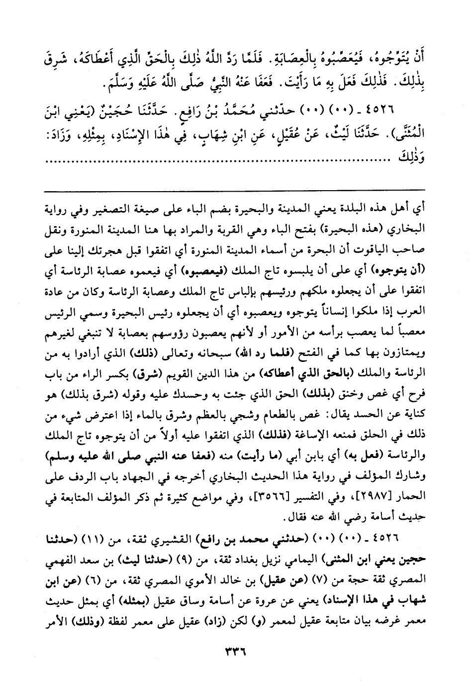 ٤٥٢٦ - (٠٠) (٠٠) (حدثني محمد بن رافع) القشيري ثقة، من (١١) (حدثنا حجين يعني ابن المثنى) اليمامي نزيل بغداد ثقة، من (٩) (حدثنا ليث) بن سعد الفهمي المصري ثقة حجة من (٧) (عن عقيل) بن خالد الأموي المصري ثقة، من (٦) (عن ابن شهاب في هذا الإسناد) يعني عن عروة عن أسامة وساق عقيل (بمثله) أي بمثل حديث معمر غرضه بيان متابعة عقيل لمعمر (و) لكن (زاد) عقيل على معمر لفظة (وذلك) الأمر