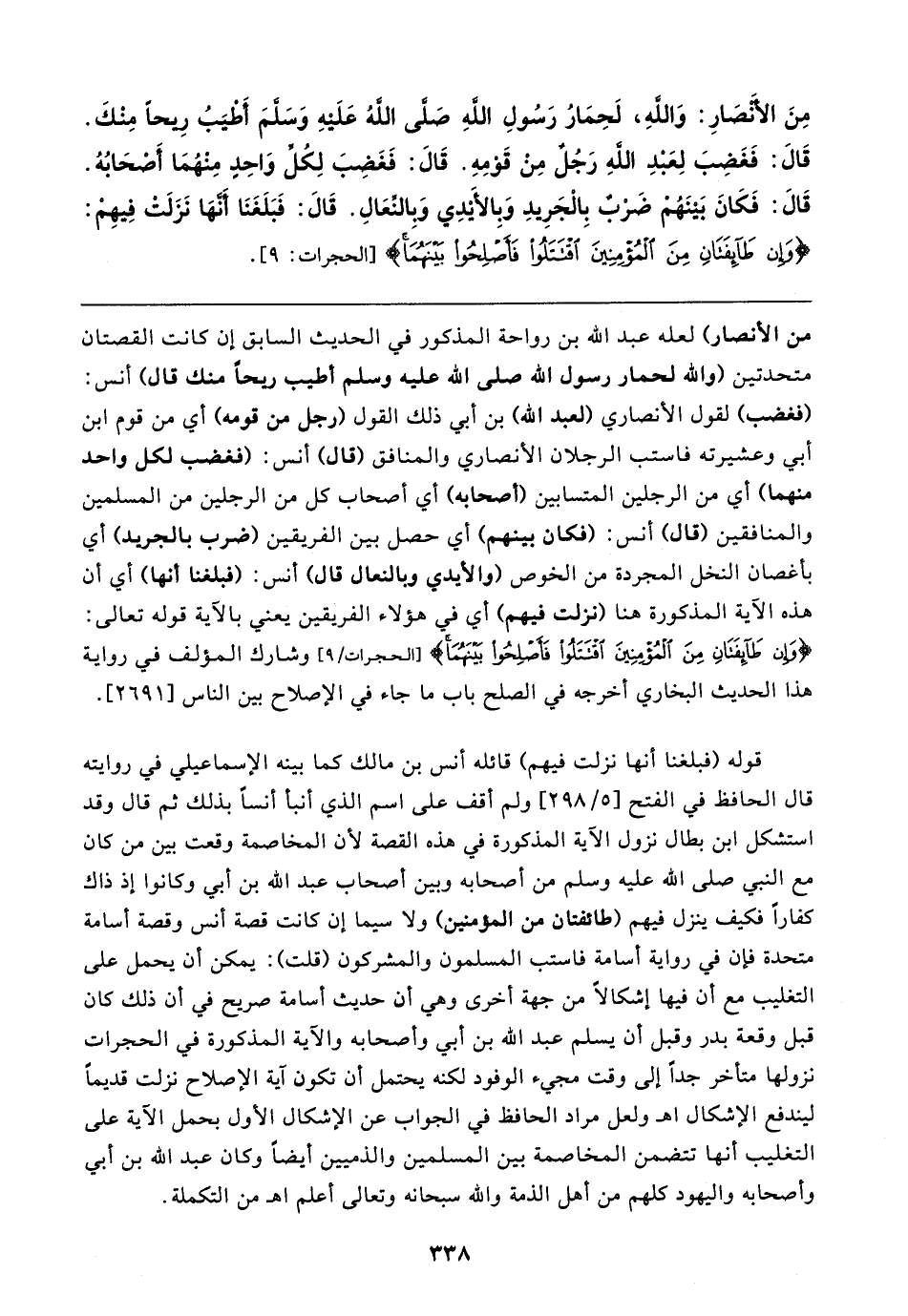 من الأنصار) لعله عبد الله بن رواحة المذكور في الحديث السابق إن كانت القصتان متحدتين (والله لحمار رسول الله صلى الله عليه وسلم أطيب ريحًا منك قال) أنس: (فغضب) لقول الأنصاري (لعبد الله) بن أبي ذلك القول (رجل من قومه) أي من قوم ابن أبي وعشيرته فاستب الرجلان الأنصاري والمنافق (قال) أنس: (فغضب لكل واحد منهما) أي من الرجلين المتسابين (أصحابه) أي أصحاب كل من الرجلين من المسلمين والمنافقين (قال) أنس: (فكان بينهم) أي حصل بين الفريقين (ضرب بالجريد) أي بأغصان النخل المجردة من الخوص (والأيدي وبالنعال قال) أنس: (فبلغنا أنها) أي أن هذه الآية المذكورة هنا (نزلت فيهم) أي في هؤلاء الفريقين يعني بالآية قوله تعالى: {وَإِنْ طَائِفَتَانِ مِنَ الْمُؤْمِنِينَ اقْتَتَلُوا فَأَصْلِحُوا بَينَهُمَا} [الحجرات: ٩] وشارك المؤلف في رواية هذا الحديث البخاري أخرجه في الصلح باب ما جاء في الإصلاح بين الناس [٢٦٩١].