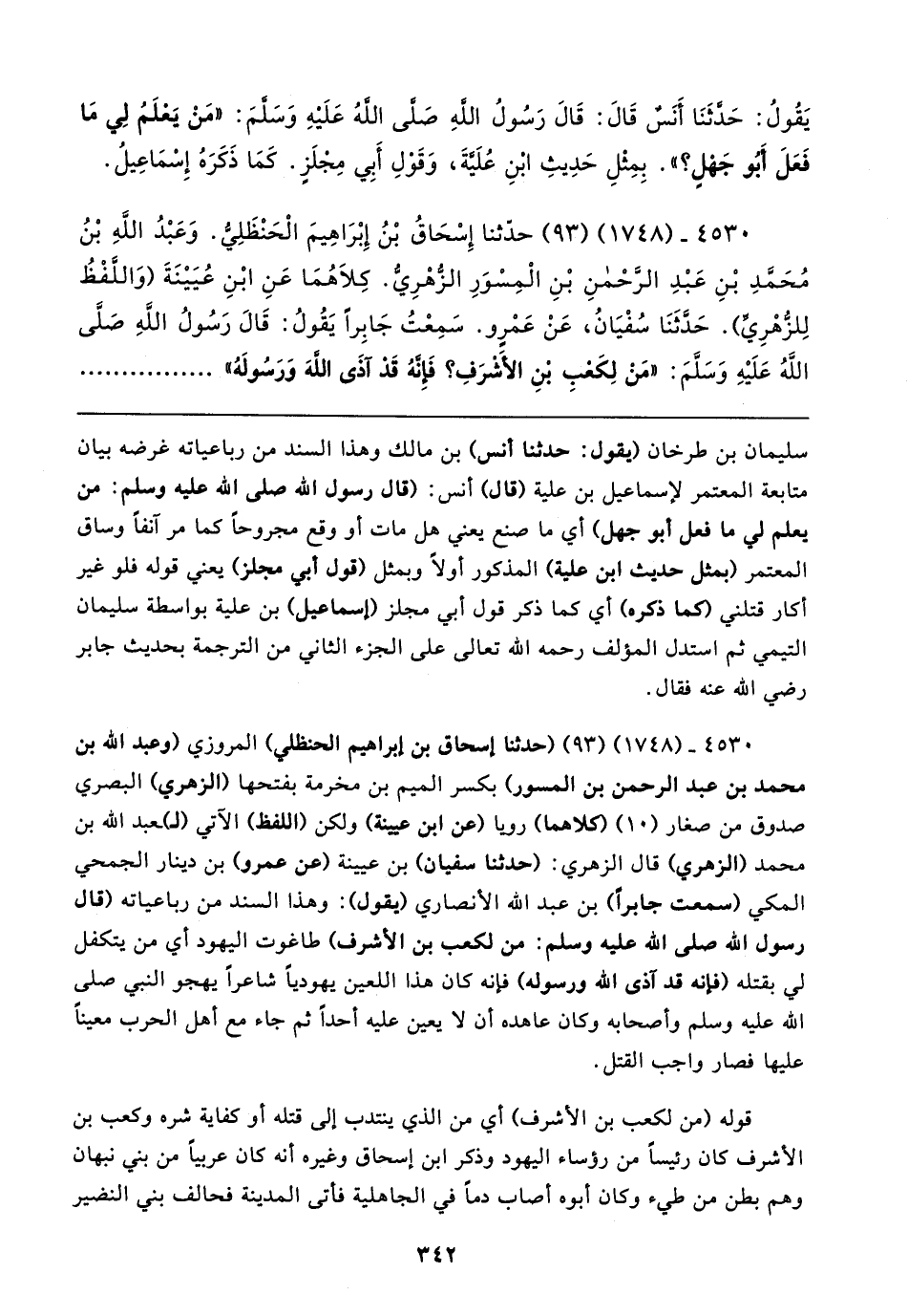 ٤٥٣٠ - (١٧٤٨) (٩٣) حَدَّثَنَا إِسْحَاقُ بْنُ إِبْرَاهِيمَ الْحَنْظَلِيُّ. وَعَبْدُ اللَّهِ بْنُ مُحَمَّدِ بْنِ عَبْدِ الرَّحْمَنِ بْنِ الْمِسْوَرِ الزُّهْرِيُّ. كِلاهُمَا عَنِ ابْنِ عُيَينَةَ (وَاللَّفْظُ لِلزُّهْرِيِّ) حَدَّثَنَا سُفْيَانُ، عَنْ عَمْرٍو. سَمِعْتُ جَابِرًا يَقُولُ: قَال رَسُولُ اللهِ صلى الله عليه وسلم: "مَنْ لِكَعْبِ بْنِ الأَشْرَفِ؟ فَإِنَّهُ قَدْ آذَى اللَّهَ وَرَسُولَهُ"