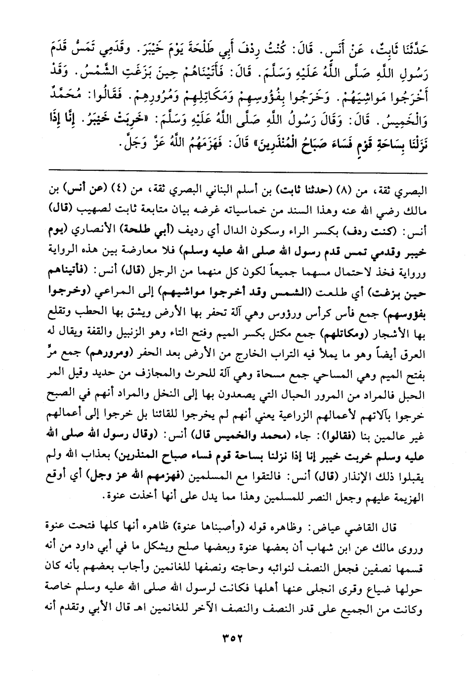 حَدَّثَنَا ثَابِتٌ، عَنْ أَنَسٍ. قَال: كُنْتُ رِدْفَ أَبِي طَلْحَةَ يَوْمَ خَيبَرَ. وَقَدَمِي تَمَسُّ قَدَمَ رَسُولِ اللَّهِ صلى الله عليه وسلم. قَال: فَأَتَينَاهُمْ حِينَ بَزَغَتِ الشَّمْسُ. وَقَدْ أَخْرَجُوا مَوَاشِيَهُمْ. وَخَرَجُوا بِفُئُوسِهِمْ وَمَكَاتِلِهِمْ وَمُرُورِهِمْ. فَقَالُوا: مُحَمَّدٌ وَالْخَمِيسَ. قَال: رَسُولُ اللهِ صلى الله عليه وسلم: "خَرِبَتْ خَيبَرُ. إِنَّا إِذَا نَزَلْنَا بِسَاحَةِ قَوْمٍ فَسَاءَ صَبَاحُ الْمُنْذَرِينَ " قَال: فَهَزَمَهُمُ اللَّهُ عَزَّ وَجَلَّ