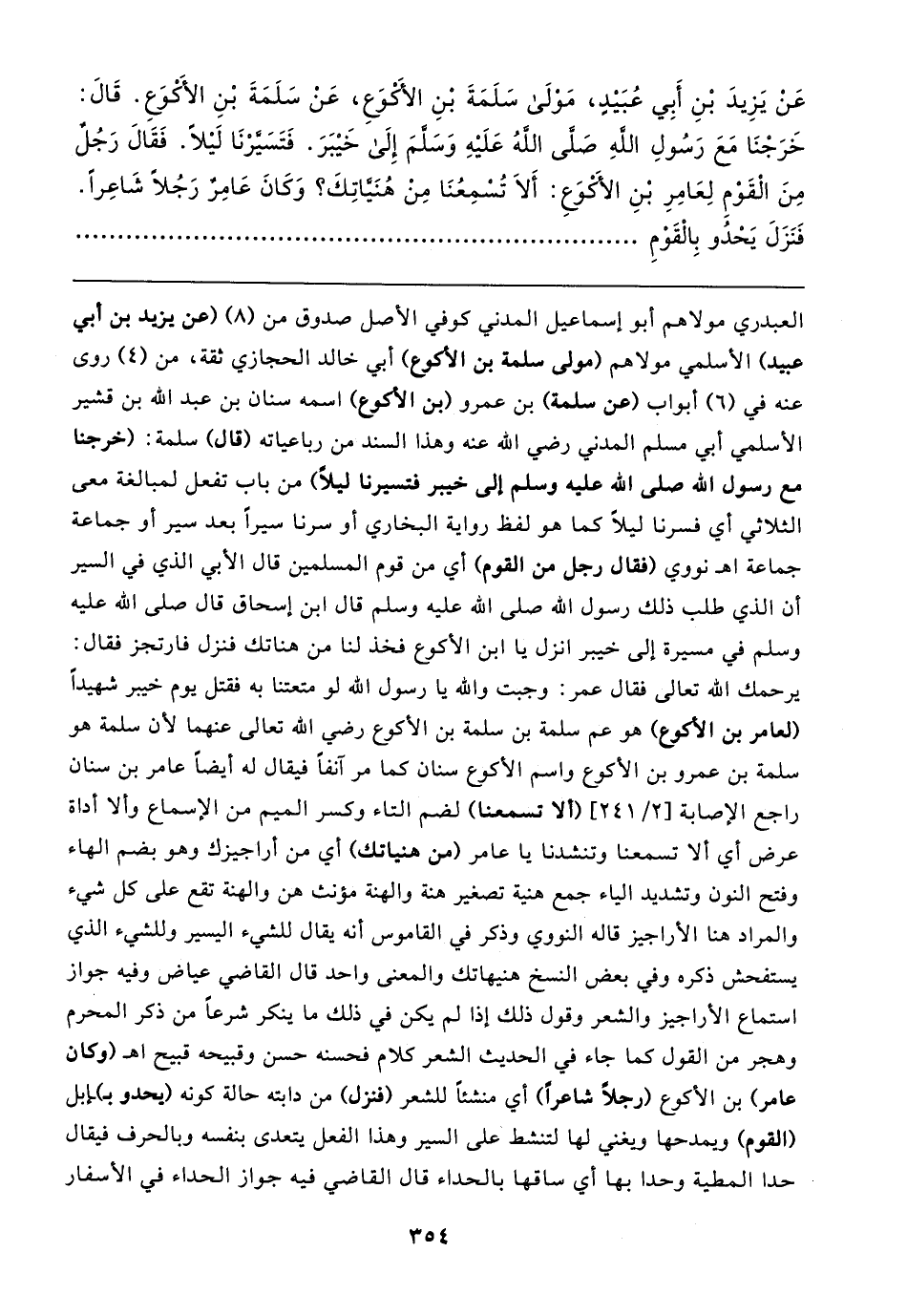 العبدري مولاهم أبو إسماعيل المدني كوفي الأصل صدوق من (٨) (عن يزيد بن أبي عبيد) الأسلمي مولاهم (مولى سلمة بن الأكوع) أبي خالد الحجازي ثقة، من (٤) روى عنه في (٦) أبواب (عن سلمة) بن عمرو (بن الأكوع) اسمه سنان بن عبد الله بن قشير الأسلمي أبي مسلم المدني رضي الله عنه وهذا السند من رباعياته (قال) سلمة: (خرجنا مع رسول الله صلى الله عليه وسلم إلى خيبر فتسيرنا ليلًا) من باب تفعل لمبالغة معى الثلاثي أي فسرنا ليلًا كما هو لفظ رواية البخاري أو سرنا سيرًا بعد سير أو جماعة جماعة اهـ نووي (فقال رجل من القوم) أي من قوم المسلمين قال الأبي الذي في السير أن الذي طلب ذلك رسول الله صلى الله عليه وسلم قال ابن إسحاق قال صلى الله عليه وسلم في مسيرة إلى خيبر انزل يا ابن الأكوع فخذ لنا من هناتك فنزل فارتجز فقال: يرحمك الله تعالى فقال عمر: وجبت والله يا رسول الله لو متعتنا به فقتل يوم خيبر شهيدًا (لعامر بن الأكوع) هو عم سلمة بن سلمة بن الأكوع رضي الله تعالى عنهما لأن سلمة هو سلمة بن عمرو بن الأكوع واسم الأكوع سنان كما مر آنفًا فيقال له أيضًا عامر بن سنان راجع الإصابة [٢/ ٢٤١] (ألا تسمعنا) لضم التاء وكسر الميم من الإسماع وألا أداة عرض أي ألا تسمعنا وتنشدنا يا عامر (من هنياتك) أي من أراجيزك وهو بضم الهاء وفتح النون وتشديد الياء جمع هنية تصغير هنة والهنة مؤنث هن والهنة تقع على كل شيء والمراد هنا الأراجيز قاله النووي وذكر في القاموس أنه يقال للشيء اليسير وللشيء الذي يستفحش ذكره وفي بعض النسخ هنيهاتك والمعنى واحد قال القاضي عياض وفيه جواز استماع الأراجيز والشعر وقول ذلك إذا لم يكن في ذلك ما ينكر شرعًا من ذكر المحرم وهجر من القول كما جاء في الحديث الشعر كلام فحسنه حسن وقبيحه قبيح اهـ (وكان عامر) بن الأكوع (رجلًا شاعرًا) أي منشئًا للشعر (فنزل) من دابته حالة كونه (يحدو بـ) ـإبل (القوم) ويمدحها ويغني لها لتنشط على السير وهذا الفعل يتعدى بنفسه وبالحرف فيقال حدا المطية وحدا بها أي ساقها بالحداء قال القاضي فيه جواز الحداء في الأسفار