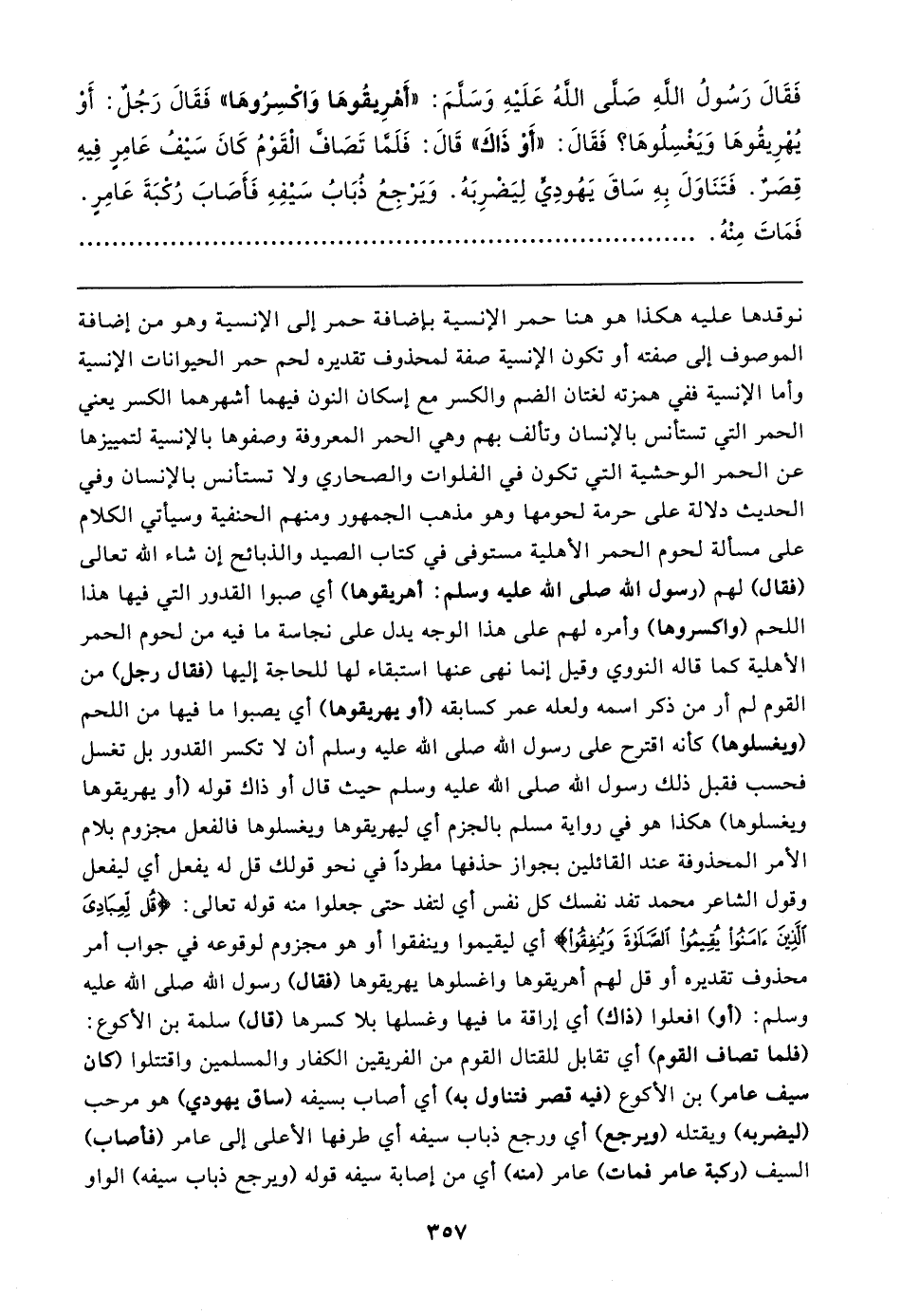 فَقَال رَسُولُ اللهِ صلى الله عليه وسلم: "أَهْرِيقُوهَا وَاكْسِرُوهَا" فَقَال رَجُلٌ: أَوْ يُهَرِيقُوهَا وَيَغْسِلُوهَا؟ فَقَال: "أَوْ ذَاكَ" قَال: فَلَمَّا تَصَافَّ الْقَوْمُ كَانَ سَيفُ عَامِرٍ فِيهِ قِصَرٌ. فَتَنَاوَلَ بِهِ سَاقَ يَهُودِيٍّ لِيَضْرِبَهُ. وَيَرْجِعُ ذُبَابُ سَيفِهِ فَأَصَابَ رُكْبَةَ عَامِرٍ. فَمَاتَ مِنْهُ