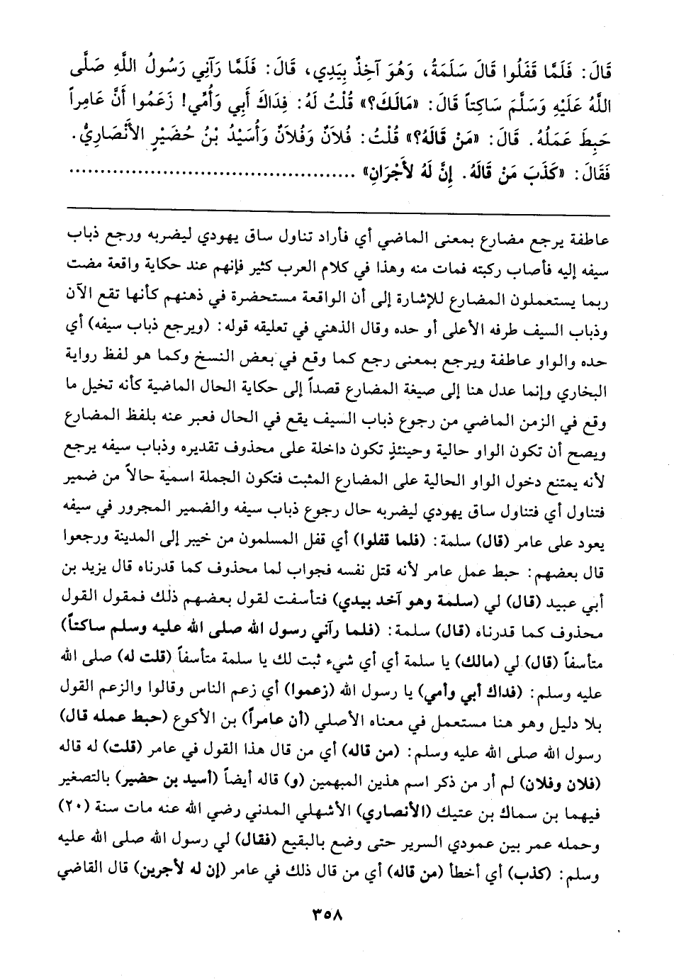 قَال: فَلَمَّا قَفَلُوا قَال سَلَمَةُ, وَهُوَ آخِذٌ بِيَدِي, قَال: فَلَمَّا رَآنِي رَسُولُ اللهِ صلى الله عليه وسلم سَاكِتًا قَال: "مَا لَكَ؟ " قُلْتُ لَهُ: فِدَاكَ أَبِي وَأُمِّي! زَعَمُوا أَنَّ عَامِرًا حَبِطَ عَمَلُهُ. قَال: "مَنْ قَالهُ؟ " قُلْتُ: فُلانٌ وَفُلانٌ وَأُسَيدُ بْنُ حُضَيرٍ الأَنْصَارِيُّ. فَقَال: "كَذَبَ مَنْ قَالهُ. إِنَّ لَهُ لأَجْرَانِ"
