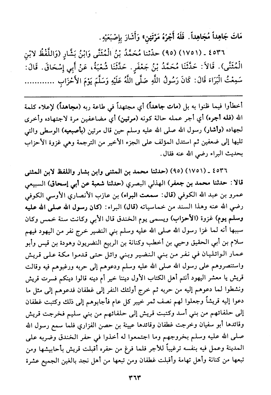 ٤٥٣٦ - (١٧٥١) (٩٥) حَدَّثَنَا مُحَمَّدُ بْنُ الْمُثَنَّى وَابْنُ بَشَّارٍ (وَاللَّفْظُ لابْنِ الْمُثَنَّى). قَالا: حَدَّثَنَا مُحَمَّدُ بْنُ جَعْفَرٍ. حَدَّثَنَا شُعْبَةُ، عَنْ أَبِي إِسْحَاقَ. قَال: سَمِعْتُ الْبَرَاءَ قَال: كَانَ رَسُولُ اللهِ صلى الله عليه وسلم يَوْمَ الأَحْزَابِ