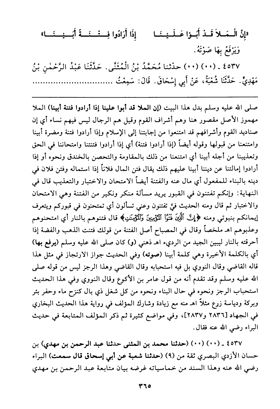 ٤٥٣٧ - (٠٠) (٠٠) (حدثنا محمد بن المثنى حدثنا عبد الرحمن بن مهدي) بن حسان الأزدي البصري ثقة من (٩) (حدثنا شعبة عن أبي إسحاق قال سمعت) البراء رضي الله عنه وهذا السند من خماسياته غرضه بيان متابعة عبد الرحمن بن مهدي
