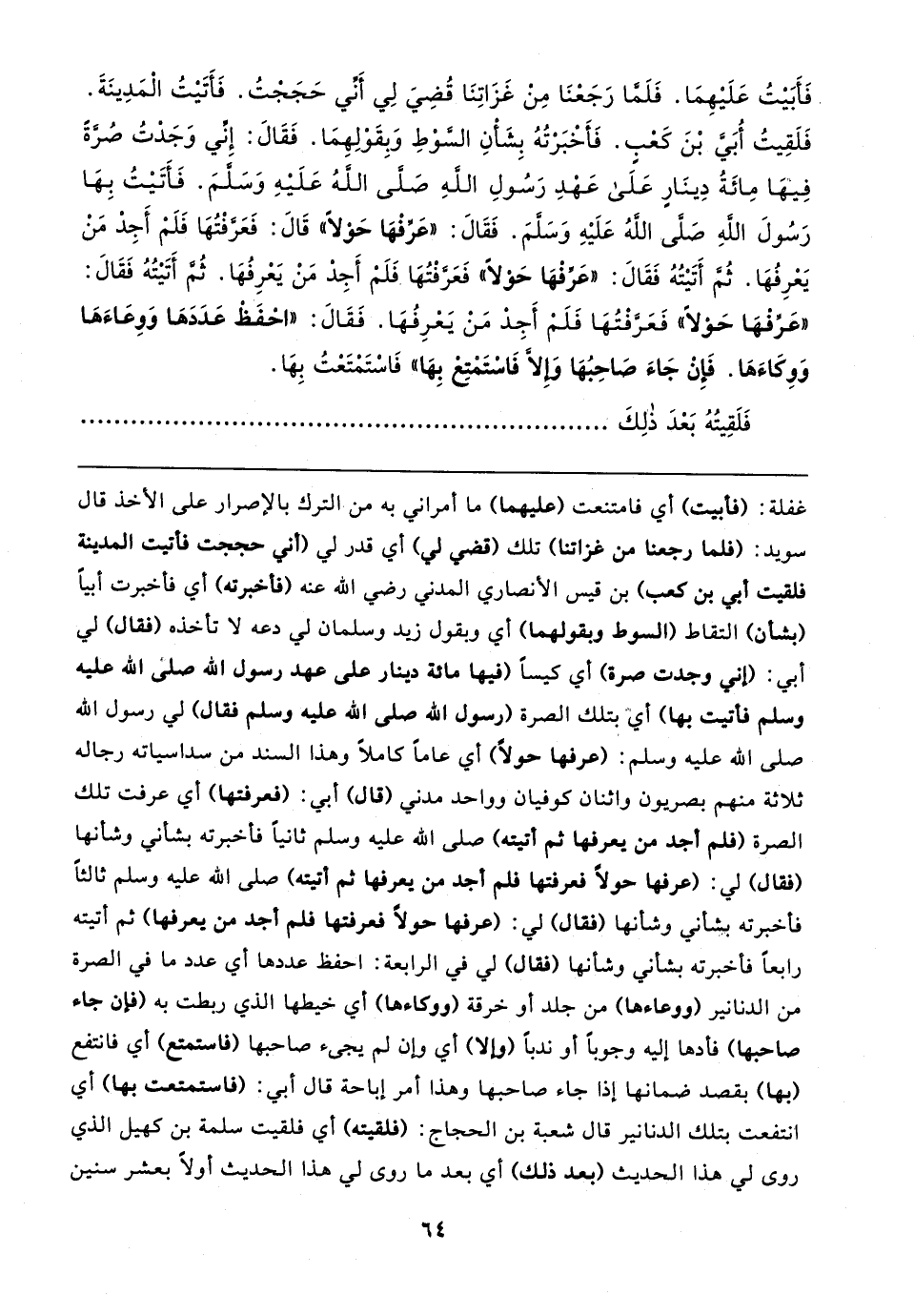 فَأَبَيتُ عَلَيهِمَا. فَلَمَّا رَجَعْنَا مِنْ غَزَاتِنَا قُضِيَ لِي أَنِّي حَجَجْتُ. فَأَتَيتُ الْمَدِينَةَ. فَلَقِيتُ أُبَيَّ بْنَ كَعْبٍ. فَأَخْبَرْتُهُ بِشَأْنِ السَّوْطِ وَبِقَوْلِهِمَا. فَقَال: إِنِّي وَجَدْتُ صُرَّةً فِيهَا مِائَةُ دِينَارٍ عَلَى عَهْدِ رَسُولِ اللهِ - صَلَّى اللهُ عَلَيهِ وَسَلَّمَ -. فَأَتَيتُ بِهَا رَسُولَ اللهِ - صَلَّى اللهُ عَلَيهِ وَسَلَّمَ -. فَقَال: "عَرِّفْهَا حَوْلًا" قَال: فَعَرَّفْتُهَا فَلَمْ أَجِدْ مَنْ يَعْرِفُهَا. ثُمَّ أَتَيتُهُ فَقَال: "عَرِّفْهَا حَوْلًا" فَعَرَّفْتُهَا فَلَمْ أَجِدْ مَنْ يَعْرِفُهَا. ثُمَّ أَتَيتُهُ فَقَال: "عَرِّفْهَا حَوْلًا" فَعَرَّفْتُهَا فَلَمْ أَجِدْ مَنْ يَعْرِفُهَا. فَقَال: "احْفَظْ عَدَدَهَا وَوعَاءَهَا وَوكَاءَهَا. فَإِنْ جَاءَ صَاحِبُهَا وَإِلَّا فَاسْتَمْتِعْ بِهَا" فَاسْتَمْتَعْتُ بِهَا.