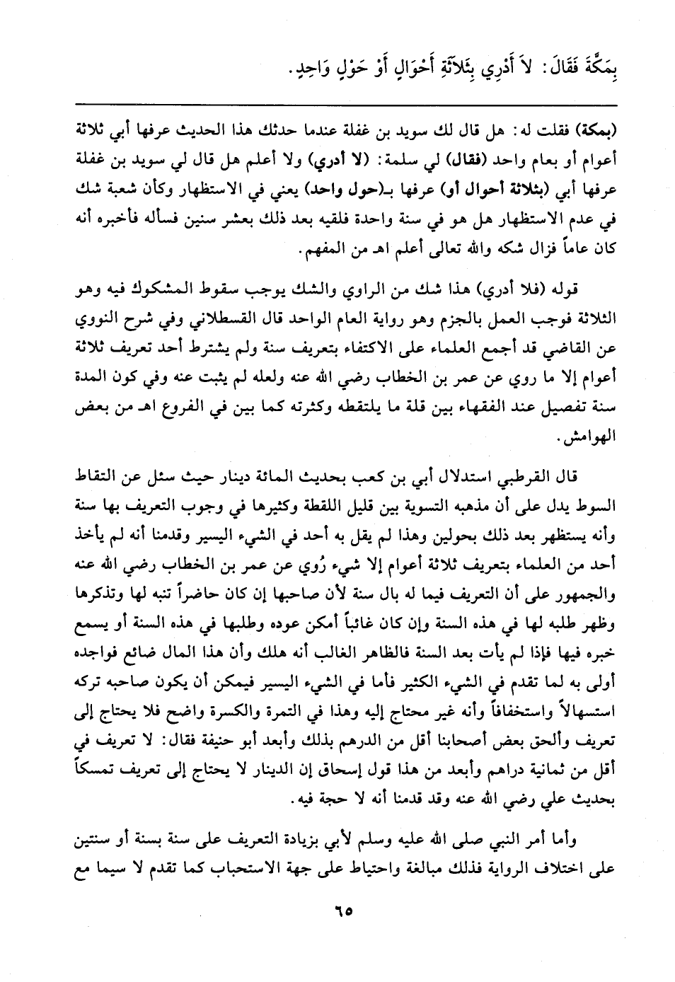 (بمكة) فقلت له: هل قال لك سويد بن غفلة عندما حدثك هذا الحديث عرفها أبي ثلاثة أعوام أو بعام واحد (فقال) لي سلمة: (لا أدري) ولا أعلم هل قال لي سويد بن غفلة عرفها أبي (بثلاثة أحوال أو) عرفها بـ (حول واحد) يعني في الاستظهار وكأن شعبة شك في عدم الاستظهار هل هو في سنة واحدة فلقيه بعد ذلك بعشر سنين فسأله فأخبره أنَّه كان عامًا فزال شكه والله تعالى أعلم اهـ من المفهم.