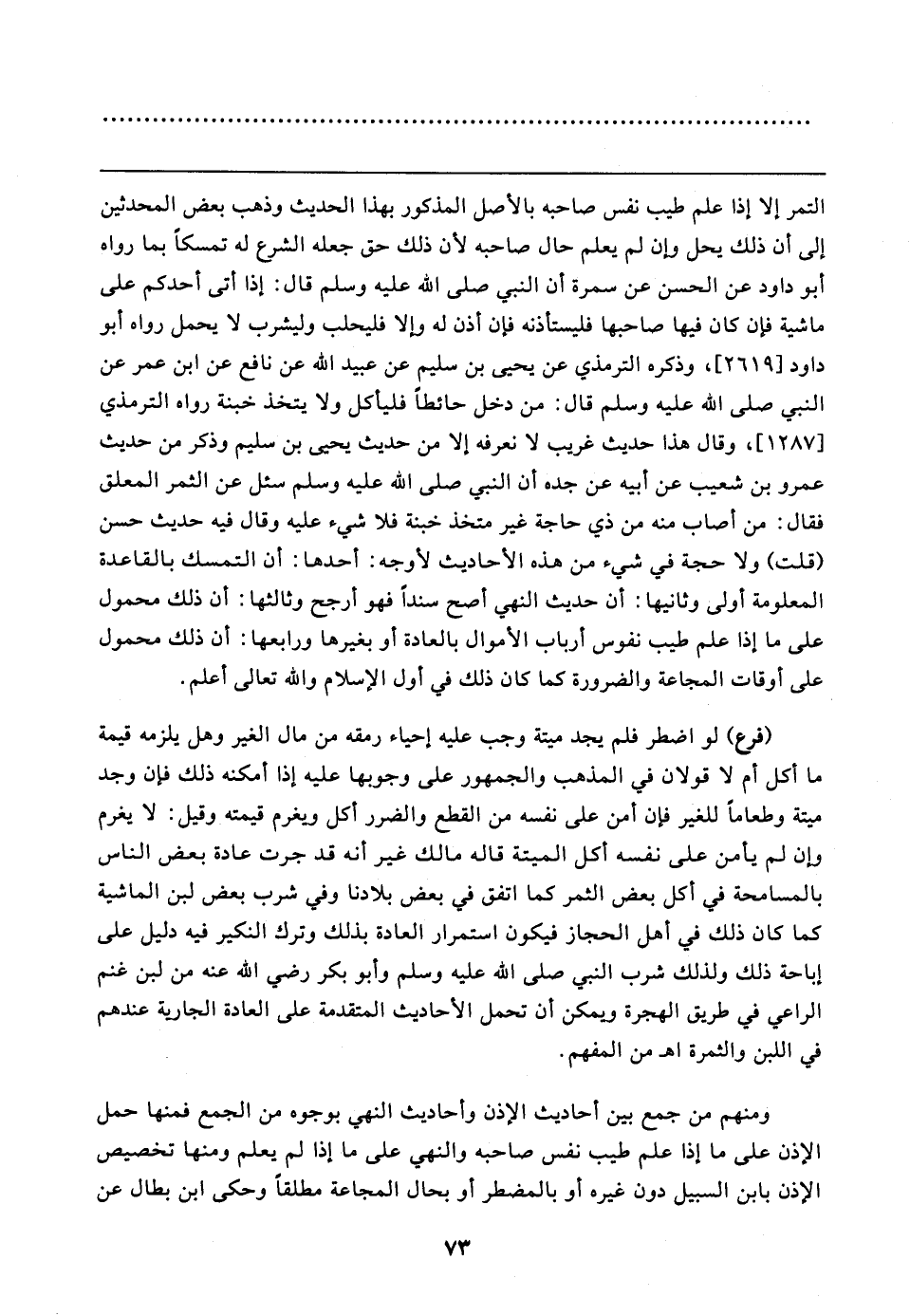 التمر إلا إذا علم طيب نفس صاحبه بالأصل المذكور بهذا الحديث وذهب بعض المحدثين إلى أن ذلك يحل وإن لم يعلم حال صاحبه لأنَّ ذلك حق جعله الشرع له تمسكًا بما رواه أبو داود عن الحسن عن سمرة أن النبي - صلى الله عليه وسلم - قال: إذا أتى أحدكم على ماشية فإن كان فيها صاحبها فليستأذنه فإن أذن له وإلا فليحلب وليشرب لا يحمل رواه أبو داود [٢٦١٩]، وذكره الترمذي عن يحيى بن سليم عن عبيد الله عن نافع عن ابن عمر عن النبي - صلى الله عليه وسلم - قال: من دخل حائطًا فليأكل ولا يتخذ خبنة رواه الترمذي [١٢٨٧]، وقال هذا حديث غريب لا نعرفه إلا من حديث يحيى بن سليم وذكر من حديث عمرو بن شعيب عن أبيه عن جده أن النبي - صلى الله عليه وسلم - سئل عن الثمر المعلق فقال: من أصاب منه من ذي حاجة غير متخذ خبنة فلا شيء عليه وقال فيه حديث حسن (قلت) ولا حجة في شيء من هذه الأحاديث لأوجه: أحدها: أن التمسك بالقاعدة المعلومة أولى وثانيها: أن حديث النهي أصح سندًا فهو أرجح وثالثها: أن ذلك محمول على ما إذا علم طيب نفوس أرباب الأموال بالعادة أو بغيرها ورابعها: أن ذلك محمول على أوقات المجاعة والضرورة كما كان ذلك في أول الإِسلام والله تعالى أعلم.