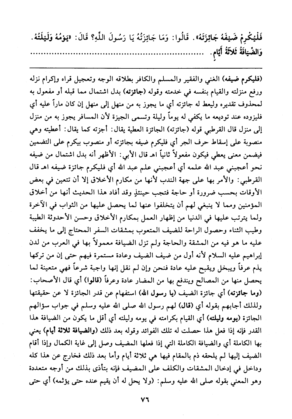فَلْيُكْرِمْ ضَيفَهُ جَائِزَتَهُ". قَالُوا: وَمَا جَائِزَتُهُ يَا رَسُولَ اللهِ؟ قَال: "يَوْمُهُ وَلَيلَتُهُ. وَالضِّيَافَةُ ثَلاثَةُ أَيَّامٍ
