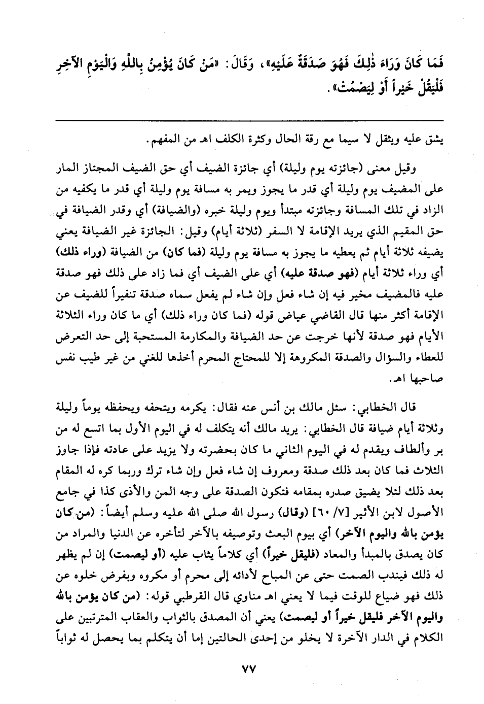 قال الخطابي: سئل مالك بن أنس عنه فقال: يكرمه ويتحفه ويحفظه يومًا وليلة وثلاثة أيام ضيافة قال الخطابي: يريد مالك أنَّه يتكلف له في اليوم الأول بما اتسع له من بر وألطاف ويقدم له في اليوم الثاني ما كان بحضرته ولا يزيد على عادته فإذا جاوز الثلاث فما كان بعد ذلك صدقة ومعروف إن شاء فعل وإن شاء ترك وربما كره له المقام بعد ذلك لئلا يضيق صدره بمقامه فتكون الصدقة على وجه المن والأذى كذا في جامع الأصول لابن الأثير [٧/ ٦٠] (وقال) رسول الله - صلى الله عليه وسلم - أيضًا: (من كان يؤمن بالله واليوم الآخر) أي بيوم البعث وتوصيفه بالآخر لتأخره عن الدنيا والمراد من كان يصدق بالمبدأ والمعاد (فليقل خيرًا) أي كلامًا يثاب عليه (أو ليصمت) إن لم يظهر له ذلك فيندب الصمت حتى عن المباح لأدائه إلى محرم أو مكروه وبفرض خلوه عن ذلك فهو ضياع للوقت فيما لا يعني اهـ مناوي قال القرطبي قوله: (من كان يؤمن بالله واليوم الآخر فليقل خيرًا أو ليصمت) يعني أن المصدق بالثواب والعقاب المترتبين على الكلام في الدار الآخرة لا يخلو من إحدى الحالتين إما أن يتكلم بما يحصل له ثوابًا