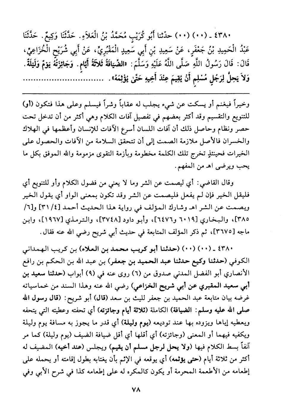 ٤٣٨٠ - (. .) (. .) حدَّثنا أَبُو كُرَيبٍ مُحَمَّدُ بْنُ الْعَلاءِ. حَدَّثَنَا وَكِيعٌ. حَدَّثَنَا عَبْدُ الْحَمِيدِ بْنُ جَعْفَرٍ، عَنْ سَعِيدِ بْنِ أَبِي سَعِيدٍ الْمَقْبُرِيِّ، عَنْ أَبِي شُرَيحٍ الْخُزَاعِيِّ، قَال: قَال رَسُولُ اللهِ - صَلَّى اللهُ عَلَيهِ وَسَلَّمَ -: "الضِّيَافَةُ ثَلاثَةُ أَيَّامٍ. وَجَائِزَتُهُ يَوْمٌ وَلَيلَةٌ. وَلَا يَحِلُّ لِرَجُلٍ مُسْلِمٍ أَنْ يُقِيمَ عِنْدَ أَخِيهِ حَتَّى يُؤْثِمَهُ"