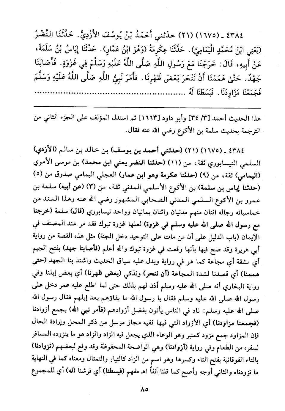 ٤٣٨٤ - (١٦٧٥) (٢١) (حدثني أحمد بن يوسف) بن خالد بن سالم (الأزدي) السلمي النيسابوري ثقة، من (١١) (حدثنا النضر يعني ابن محمَّد) بن موسى الأموي (اليمامي) ثقة، من (٩) (حدثنا عكرمة وهو ابن عمار) العجلي اليمامي صدوق من (٥) (حدثنا إياس بن سلمة) بن الأكوع الأسلمي المدني ثقة، من (٣) (عن أبيه) سلمة بن عمرو بن الأكوع السلمي المدني الصحابي المشهور - رضي الله عنه - وهذا السند من خماسياته رجاله اثنان منهم مدنيان واثنان يمانيان وواحد نيسابوري (قال) سلمة (خرجنا مع رسول الله - صلى الله عليه وسلم - في غزوة) لعلها غزوة تبوك فقد مر عند المصنف في الإيمان (باب الدليل على أن من مات على التوحيد دخل الجنة) مثل هذه القصة من رواية أبي هريرة وقد صح فيها بأنها وقعت في غزوة تبوك والله أعلم (فأصابنا جهد) بفتح الجيم أي مشقة أي مجاعة كما هو في رواية ويدل عليه سياق الحديث واشتد بنا الجهد (حتى هممنا) أي قصدنا لشدة المجاعة (أن ننحر) ونذكي (بعض ظهرنا) أي بعض إبلنا وفي رواية البخاري أنَّه - صلى الله عليه وسلم - أذن لهم بذلك حتى لما اطلع عليه عمر دخل على رسول الله - صلى الله عليه وسلم - فقال يا رسول الله ما بقاؤهم بعد إبلهم فقال رسول الله - صلى الله عليه وسلم -: ناد في الناس يأتون بفضل أزوادهم (فأمر نبي الله) بجمع أزوادنا (فجمعنا مزاودنا) أي الأزواد التي فيها ففيه مجاز مرسل من ذكر المحل وإرادة الحال فإن المزاود جمع مزود كمنبر وهو الوعاء الذي يجعل فيه الزاد والزاد هو ما يتزوده المسافر لسفره من الطعام وفي رواية (أزوادنا) وهي الواضحة المحفوظة وقد وقع لبعضهم (تزوادنا) بالتاء الفوقانية بفتح التاء وكسرها وهو اسم من الزاد كالتيار والتمثال ومعناه كما في النهاية ما تزودناه والثاني أوجه وأصح كما قلنا آنفًا اهـ مفهم (فبسطنا) أي فرشنا (له) أي للمجموع