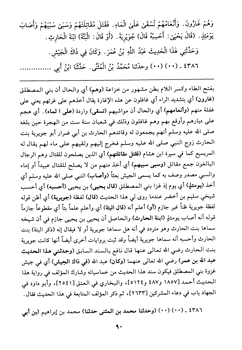 بفتح الطاء وكسر اللام بطن مشهور من خزاعة (وهم) أي والحال أن بني المصطلق (غارون) أي بتشديد الراء أي غافلون عن هذه الإغارة يقال أخذهم على غرتهم يعني على غفلة منهم (وأنعامهم) أي والحال أن مواشيهم (تسقى) واردة (على الماء). أي هجم على ديارهم وأوقع بهم وهم غافلون وذلك في شعبان سنة ست من الهجرة حين بلغه - صلى الله عليه وسلم - أنهم يجمعون له وقائدهم الحارث بن أبي ضرار أبو جويرية بنت الحارث زوج النبي - صلى الله عليه وسلم - فخرج إليهم ولقيهم على ماء لهم يقال له المريسيع كما في سيرة ابن هشام (فقتل مقاتلتهم) أي الذين يصلحون للقتال وهم الرجال البالغون جمع مقاتل (وسبى سبيهم) أي أخذ منهم من لا يصلح للقتال عبيدًا أو إماء والسبي مصدر وصف به كما يسمى الجيش بعثًا (وأصاب) النبي - صلى الله عليه وسلم - أي أخذ (يومئذٍ) أي يوم إذ غزا بني المصطلق (قال يحيى) بن يحيى (أحسبه) أي أحسب شيخي سليم بن أخضر عندما روى لي هذا الحديث (قال) لفظة (جويرية) أي أظن قوله لفظة جويرية ظنًّا غير جازم (أو) أعلم أنَّه (قال البتة) أي وأعلم علمًا بتًا أي مقطوعًا جازمًا قوله أنَّه أصاب يومئذٍ (ابنة الحارث) والحاصل أن يحيى بن يحيى جازم في أن شيخه سماها بنت الحارث وهو متردد في أنَّه هل سماها جويرية أو لا فيقال إنه (ذكر البتة) بنت الحارث وأحسبه أنَّه سماها جويرية أيضًا وقد ثبت بروايات أخرى أيضًا أنها كانت جويرية بنت الحارث رضي الله تعالى عنها قال نافع بالسند السابق (وحدثني هذا الحديث عبد الله بن عمر) رضي الله تعالى عنهما (وكان) عبد الله (في ذاك الجيش) أي في جيش غزوة بني المصطلق فيكون سند هذا الحديث من خماسياته وشارك المؤلف في رواية هذا الحديث أحمد [١٨٥٧ و ٤٨٧ و ٥١٢٤]، والبخاري في العتق [٢٥٤١]، وأبو داود في الجهاد باب في دعاء المشركين [٢٦٣٣]، ثمَّ ذكر المؤلف المتابعة في هذا الحديث فقال.