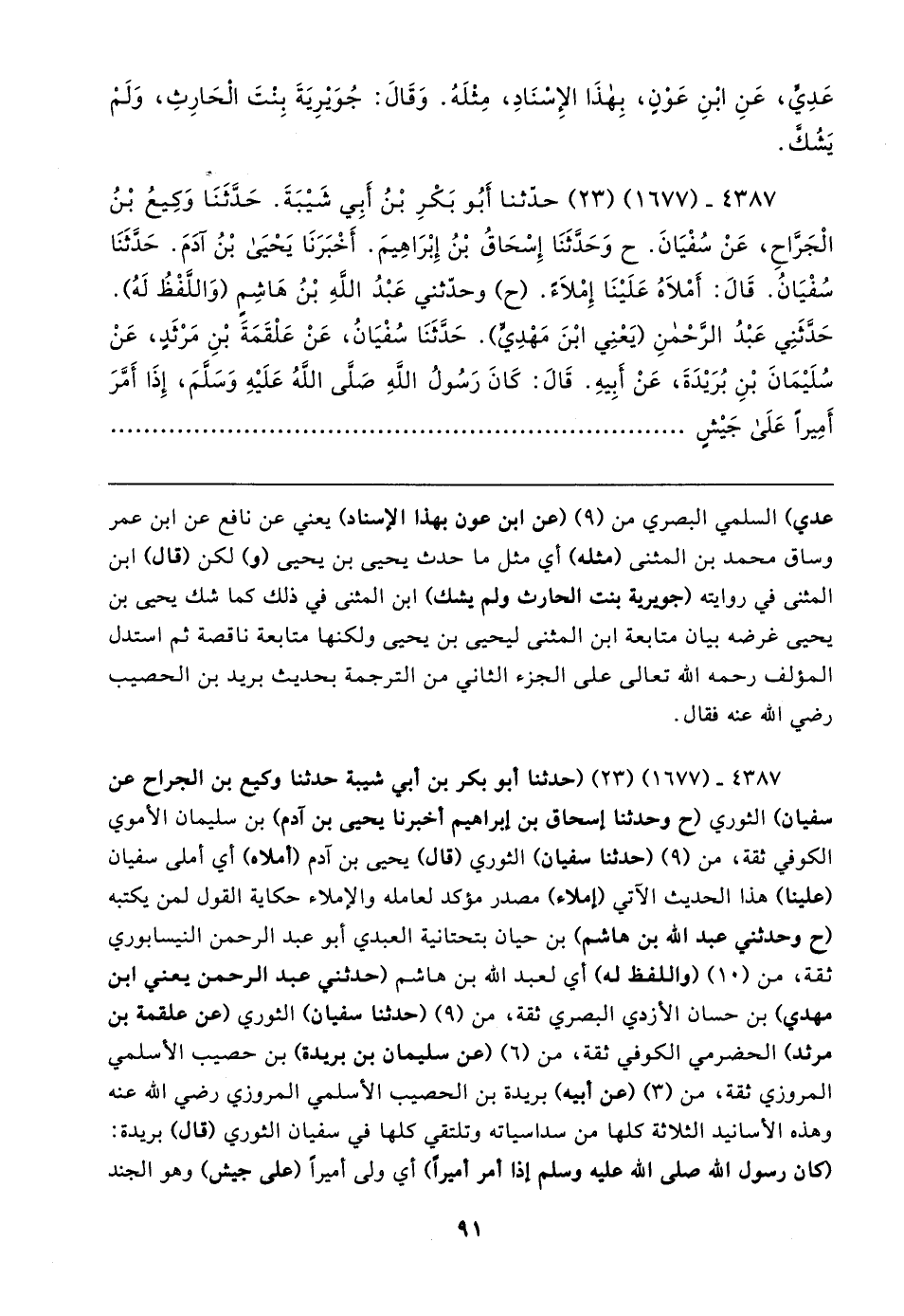 ٤٣٨٧ - (١٦٧٧) (٢٣) حدثنا أبو بكر بن أبي شيبة حدثنا وكيع بن الجراح عن سفيان) الثوري (ح وحدثنا إسحاق بن إبراهيم أخبرنا يحيى بن آدم) بن سليمان الأموي الكوفي ثقة، من (٩) (حدثنا سفيان) الثوري (قال) يحيى بن آدم (أملاه) أي أملى سفيان (علينا) هذا الحديث الآتي (إملاء) مصدر مؤكد لعامله والإملاء حكاية القول لمن يكتبه (ح وحدثني عبد الله بن هاشم) بن حيان بتحتانية العبدي أبو عبد الرحمن النيسابوري ثقة، من (١٠) (واللفظ له) أي لعبد الله بن هاشم (حدثني عبد الرحمن يعني ابن مهدي) بن حسان الأزدي البصري ثقة، من (٩) (حدثنا سفيان) الثوري (عن علقمة بن مرثد) الحضرمي الكوفي ثقة، من (٦) (عن سليمان بن بريدة) بن حصيب الأسلمي المروزي ثقة، من (٣) (عن أبيه) بريدة بن الحصيب الأسلمي المروزي - رضي الله عنه - وهذه الأسانيد الثلاثة كلها من سداسياته وتلتقي كلها في سفيان الثوري (قال) بريدة: (كان رسول الله - صلى الله عليه وسلم - إذا أمر أميرًا) أي ولى أميرًا (على جيش) وهو الجند