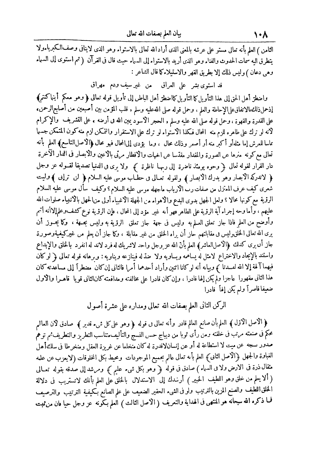الثامن العلم بأنه تعالى مستو على عرشه بالمعنى الذي أراد الله تعالى بالاستواء وهو الذي لا ينافي وصف الكبرياء ولا يتطرق إليه سمات الحدوث والفناء وهو الذي أريد بالاستواء إلى السماء حيث قال في القرآن ثم استوى إلى السماء وهي دخان وليس ذلك إلا بطريق القهر والاستيلاء كما قال الشاعر