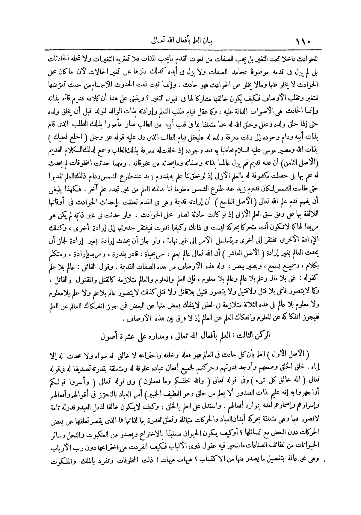 وقول القائل عالم بلا علم كقوله غني بلا مال وعلم بلا عالم وعالم بلا معلوم فإن العلم والمعلوم والعالم متلازمة كالقتل والمقتول والقاتل وكما لا يتصور قاتل بلا قتل ولا قتيل ولا يتصور قتيل بلا قاتل ولا قتل كذلك لا يتصور عالم بلا علم ولا علم بلا معلوم ولا معلوم بلا عالم بل هذه الثلاثة متلازمة في العقل لا ينفك بعض منها عن البعض فمن جوز انفكاك العالم عن العلم فليجوز انفكاكه عن المعلوم وانفكاك العلم عن العالم إذ لا فرق بين هذه الأوصاف الركن الثالث العلم بأفعال الله تعالى ومداره على عشرة أصول