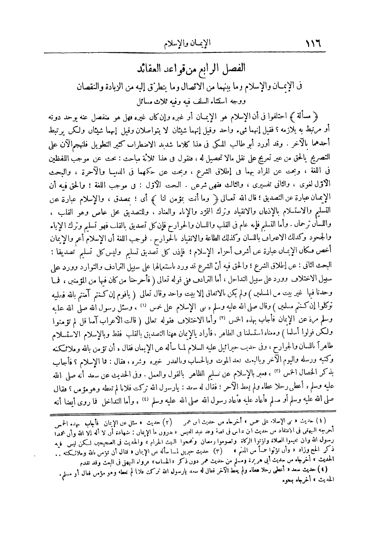 في الإيمان والإسلام وما بينهما من الاتصال وما يتطرق إليه من الزيادة والنقصان ووجه استثناء السلف فيه وفيه ثلاث مسائل