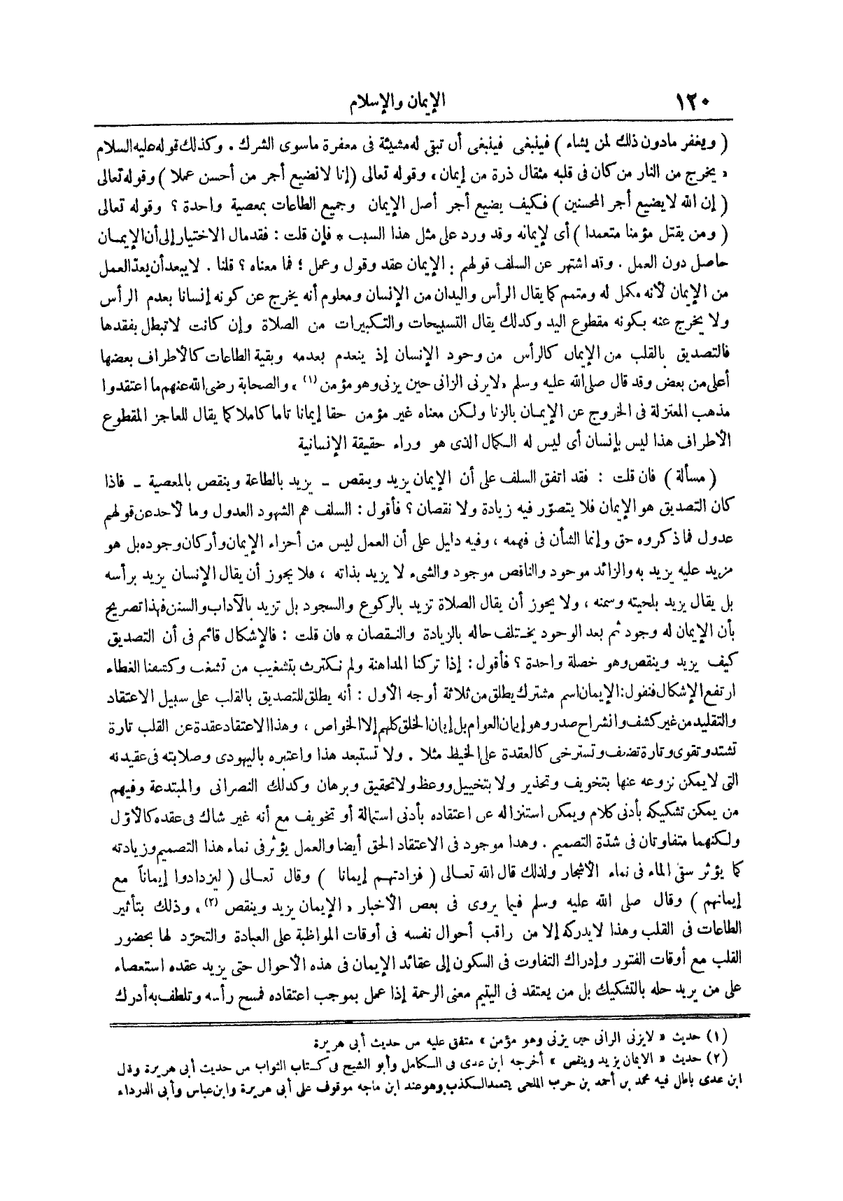 مسألة فإن قلت فقد اتفق السلف على أن الإيمان يزيد وينقص يزيد بالطاعة وينقص بالمعصية فإذا كان التصديق هو الإيمان فلا يتصور فيه زيادة ولا نقصان فأقول السلف هم الشهود العدول وما لأحد عن قولهم عدول فما ذكروه حق وإنما الشأن في فهمه وفيه دليل على أن العمل ليس من أجزاء الإيمان وأركان وجوده بل هو مزيد عليه يزيد به والزائد موجود والناقص موجود والشيء لا يزيد بذاته فلا يجوز أن يقال الإنسان يزيد برأسه بل يقال يزيد بلحيته وسمنه ولا يجوز أن يقال الصلاة تزيد بالركوع والسجود بل تزيد بالآداب والسنن فهذا تصريح بأن الإيمان له وجود ثم بعد الوجود يختلف حاله بالزيادة والنقصان