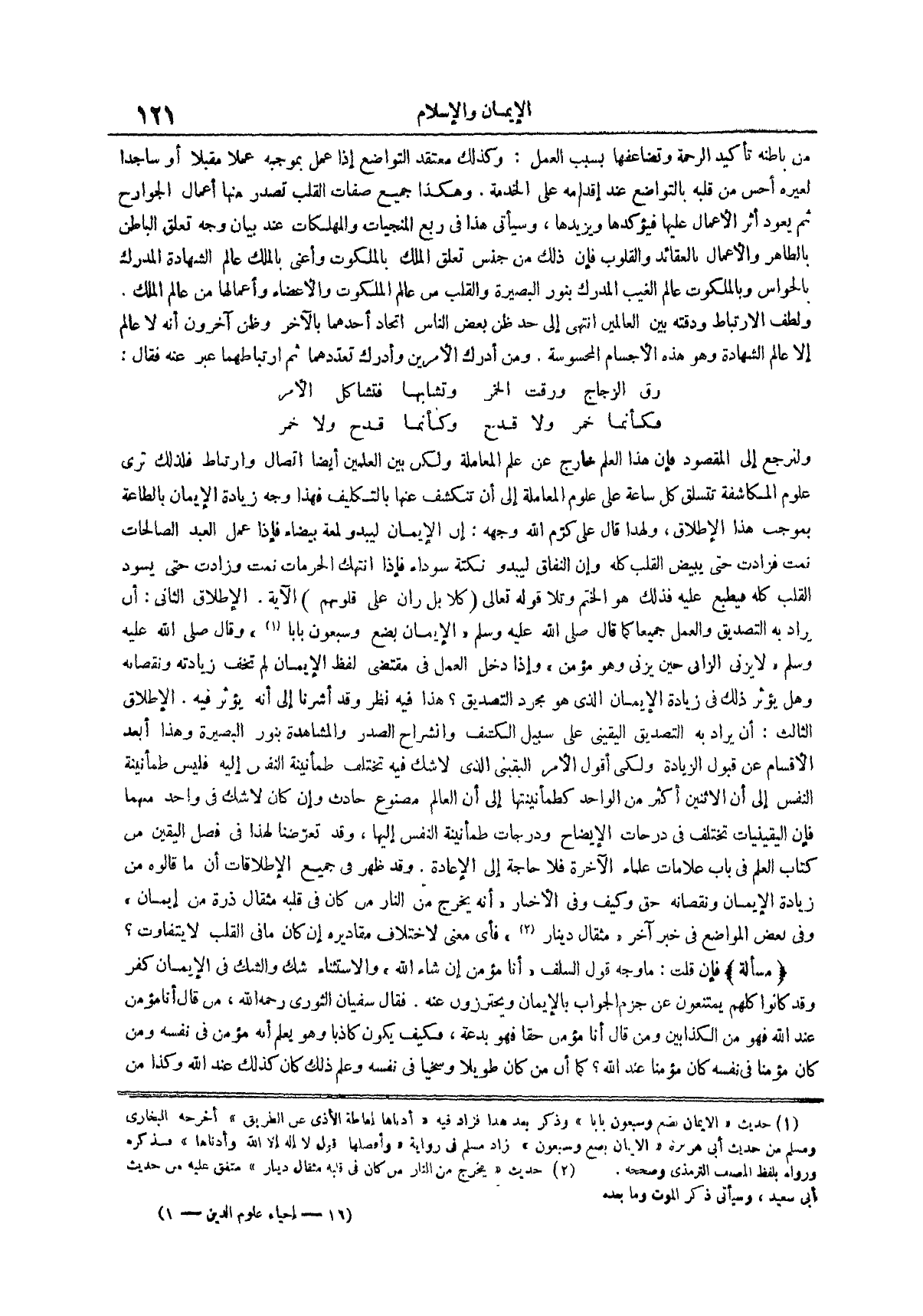 وقد ظهر في جميع الإطلاقات أن ما قالوه من زيادة الإيمان ونقصانه حق وكيف وفي الأخبار أنه يخرج من النار من كان في قلبه مثقال ذرة من إيمان وفي بعض المواضع في خبر آخر مثقال دينار (¬2) فأي معنى لاختلاف مقاديره إن كان ما في القلب لا يتفاوت