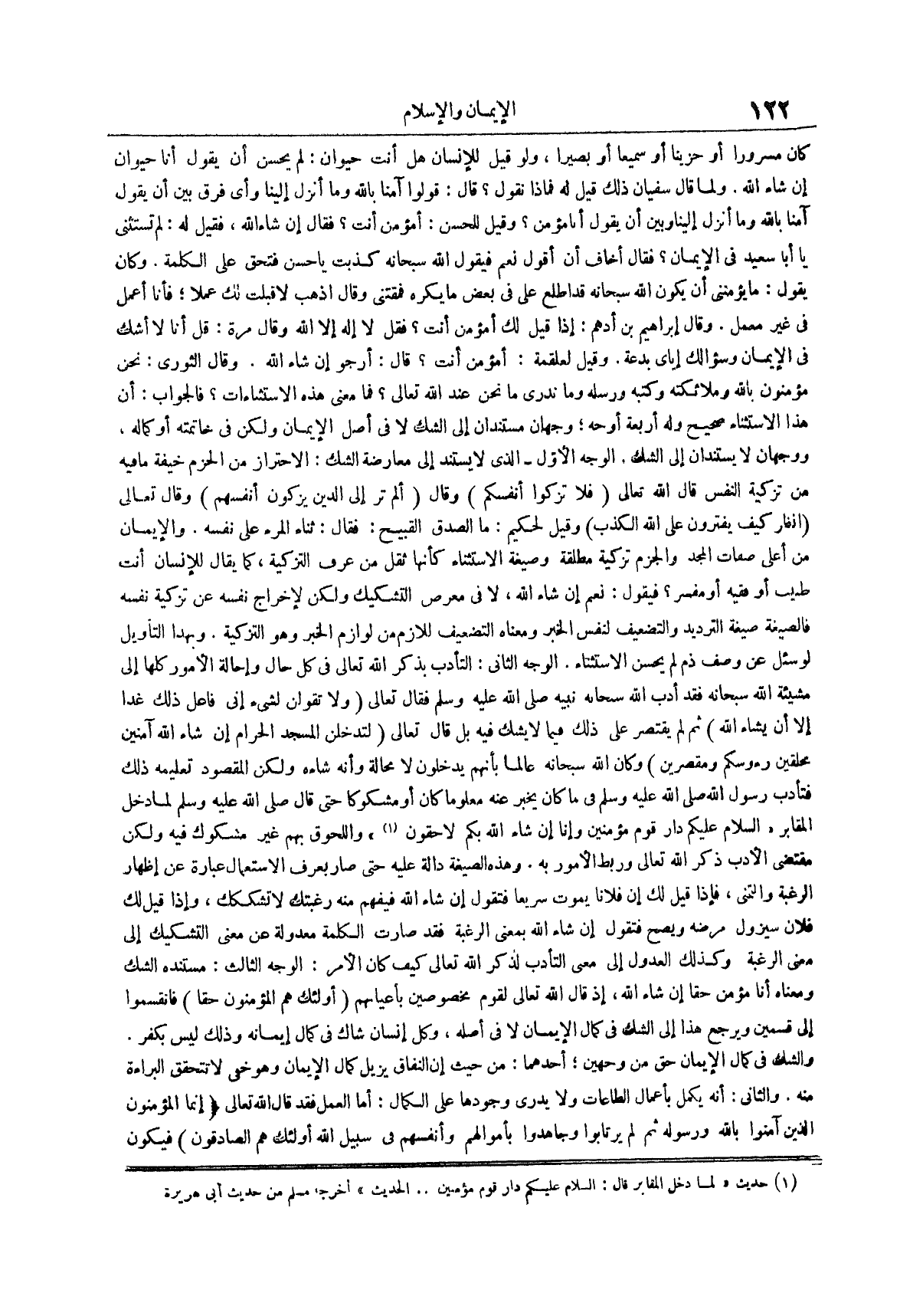 ولما قال سفيان ذلك قيل له فماذا نقول قال قولوا آمنا بالله وما أنزل إلينا وأي فرق بين أن يقول آمنا بالله وما أنزل إلينا وبين أن يقول أنا مؤمن وقيل للحسن أمؤمن أنت فقال إن شاء الله فقيل له لم تستثني يا أبا سعيد في الإيمان فقال أخاف أن أقول نعم فيقول الله سبحانه كذبت يا حسن فتحق علي الكلمة