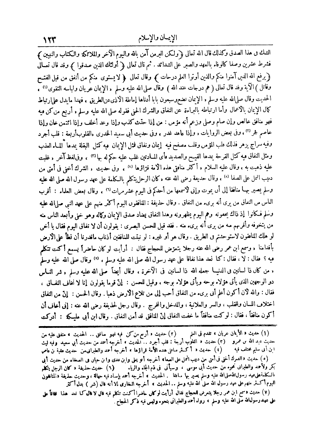 ثم قال تعالى أولئك الذين صدقوا وقد قال تَعَالَى يَرْفَعِ اللَّهُ الَّذِينَ آمَنُوا مِنْكُمْ وَالَّذِينَ أوتوا العلم درجات وقال تعالى لا يستوي منكم من أنفق من قبل الفتح وقاتل الآية وقد قال تعالى هم درجات عند الله وقال صلى الله عليه وسلم الإيمان عريان ولباسه التقوى (¬1) الحديث وقال صلى الله عليه وسلم الإيمان بضع وسبعون باباً أدناها إماطة الأذى عن الطريق فهذا ما يدل على ارتباط كمال الإيمان بالأعمال وأما ارتباطه بالبراءة عن النفاق والشرك الخفي فقوله صَلَّى اللَّهُ عَلَيْهِ وَسَلَّمَ أَرْبَعٌ مَنْ كُنَّ فيه فهو منافق خالص وإن صام وصلى وزعم أنه مؤمن مَنْ إِذَا حَدَّثَ كَذَبَ وَإِذَا وَعَدَ أَخْلَفَ وإذا اؤتمن خان وإذا خاصم فجر (¬2) وفي بعض الروايات وإذا عاهد غدر وفي حديث أبي سعيد الخدري القلوب أربعة قلب أجرد وفيه سراج يزهر فذلك قلب المؤمن وقلب مصفح فيه إيمان ونفاق فمثل الإيمان فيه كمثل البقلة يمدها الماء العذب ومثل النفاق فيه كمثل القرحة يمدها القيح والصديد فأي المادتين غلب عليه حكم له بها (¬3) وفي لفظ آخر غلبت عليه ذهبت به وقال عليه السلام أكثر منافقي هذه الأمة قراؤها (¬4) وفي حديث الشرك أخفى في أمتى من دبيب النمل على الصفا (¬5) وقال حذيفة رضي الله عنه كان الرجل يتكلم بالكلمة عَلَى عَهْدِ رَسُولِ اللَّهِ صَلَّى اللَّهُ عَلَيْهِ وسلم يصير بها منافقاً إلى أن يموت وإني لأسمعها من أحدكم في اليوم عشر مرات (¬6) وقال بعض العلماء أقرب الناس من النفاق من يرى أنه بريء من النفاق