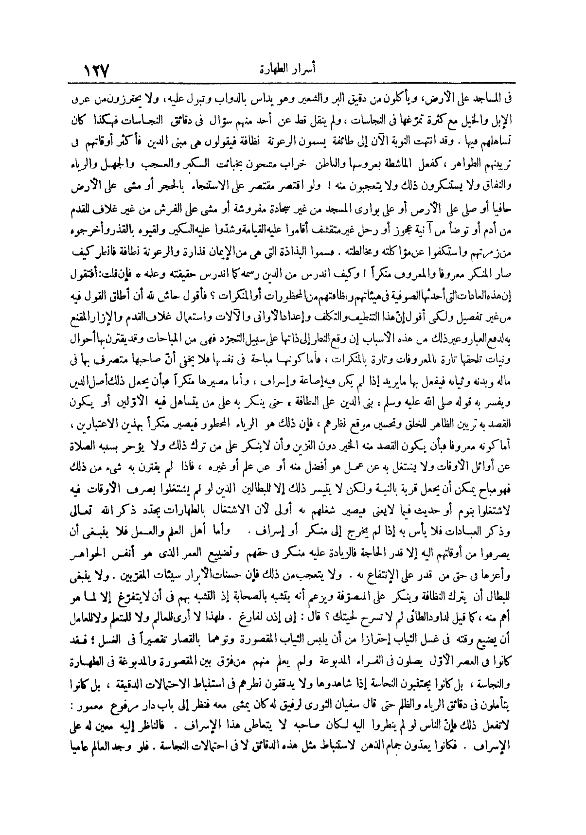 فلهذا لا أرى للعالم ولا للمتعلم ولا للعامل أن يضيع وقته في غسل الثياب إحترازاً من أن يلبس الثياب المقصورة وتوهماً بالقصار تقصيراً في الغسل فقد كانوا في العصر الأول يصلون في الفراء المدبوغة ولم يعلم منهم من فرق بين المقصورة والمدبوغة في الطهارة والنجاسة بل كانوا يجتنبون النجاسة إذا شاهدوها ولا يدققون نظرهم في استنباط الاحتمالات الدقيقة بل كانوا يتأملون في دقائق الرياء والظلم حتى قال سفيان الثوري لرفيق له كان يمشي معه فنظر إلى باب دار مرفوع معمور لا تفعل ذلك فإن الناس لو لم ينظروا إليه لكان صاحبه لا يتعاطى هذا الإسراف