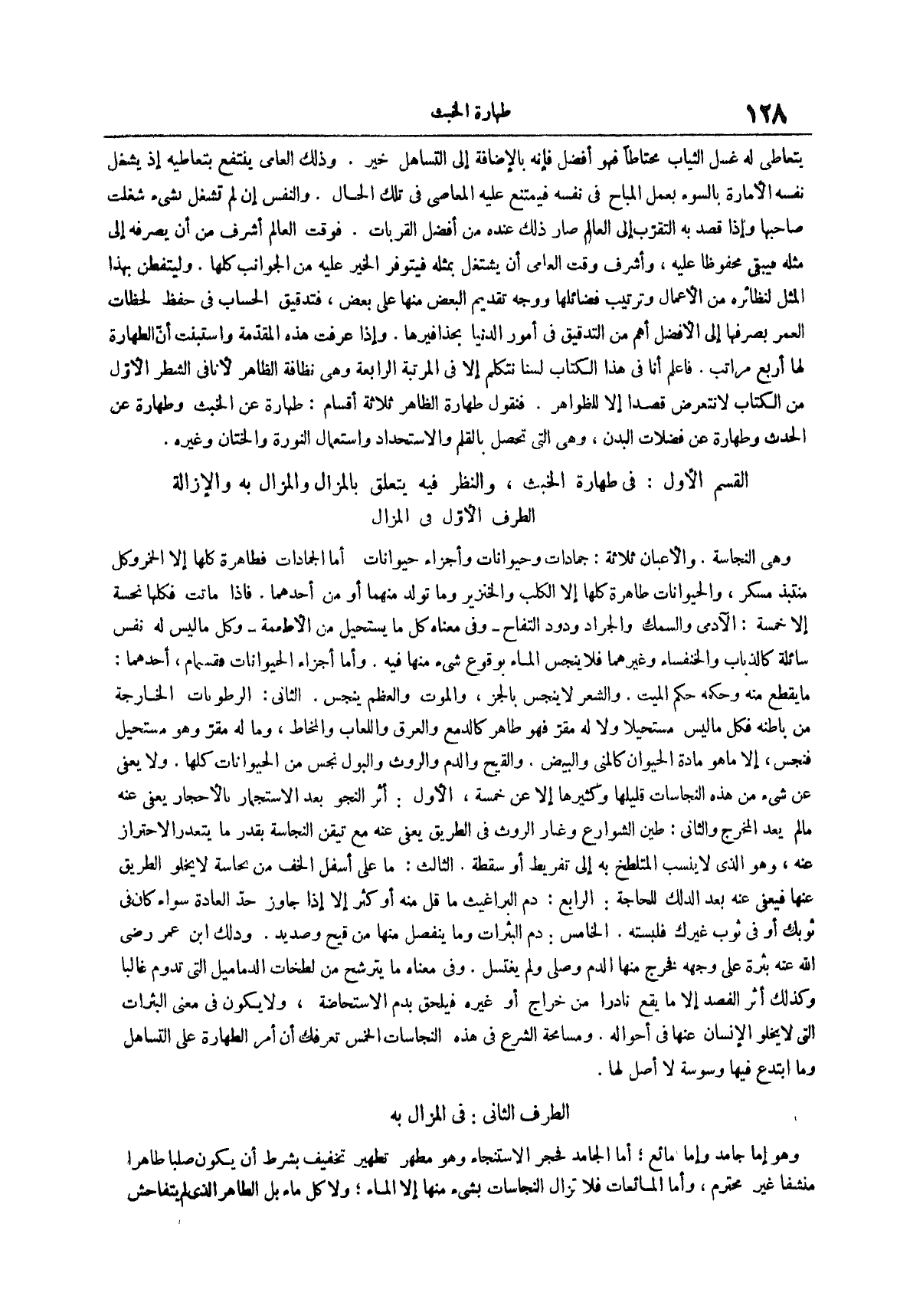 فاعلم أنا في هذا الكتاب لسنا نتكلم إلا في المرتبة الرابعة وهي نظافة الظاهر لأنا في الشطر الأول من الكتاب لا نتعرض قصداً إلا للظواهر
