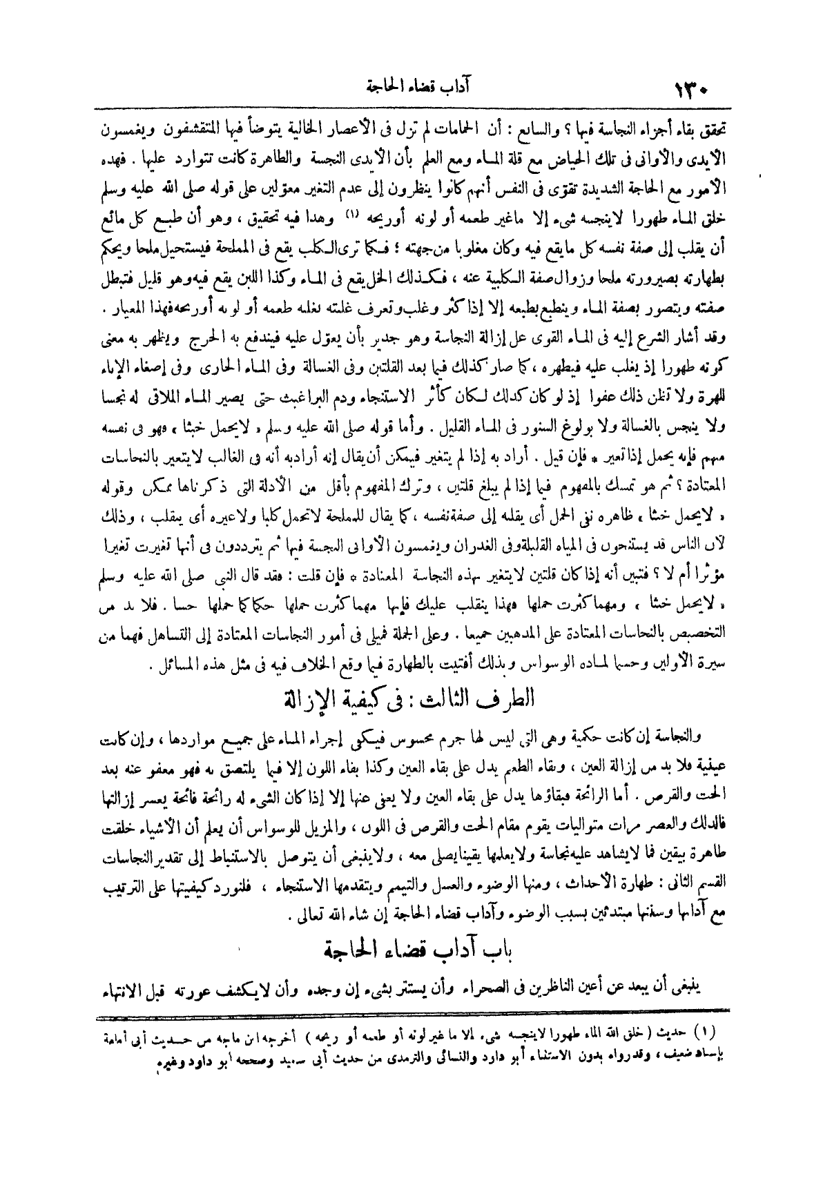 (¬1) حديث خَلَقَ اللَّهُ الْمَاءَ طَهُورًا لَا يُنَجِّسُهُ شَيْءٌ إلا ما غير لونه أو طعمه أو ريحه أخرجه ابن ماجه من حديث أبي أمامة بإسناد ضعيف وقد رواه بدون الاستثناء أبو داود والنسائي والترمذي من حديث أبي سعيد وصححه أبو داود وغيره