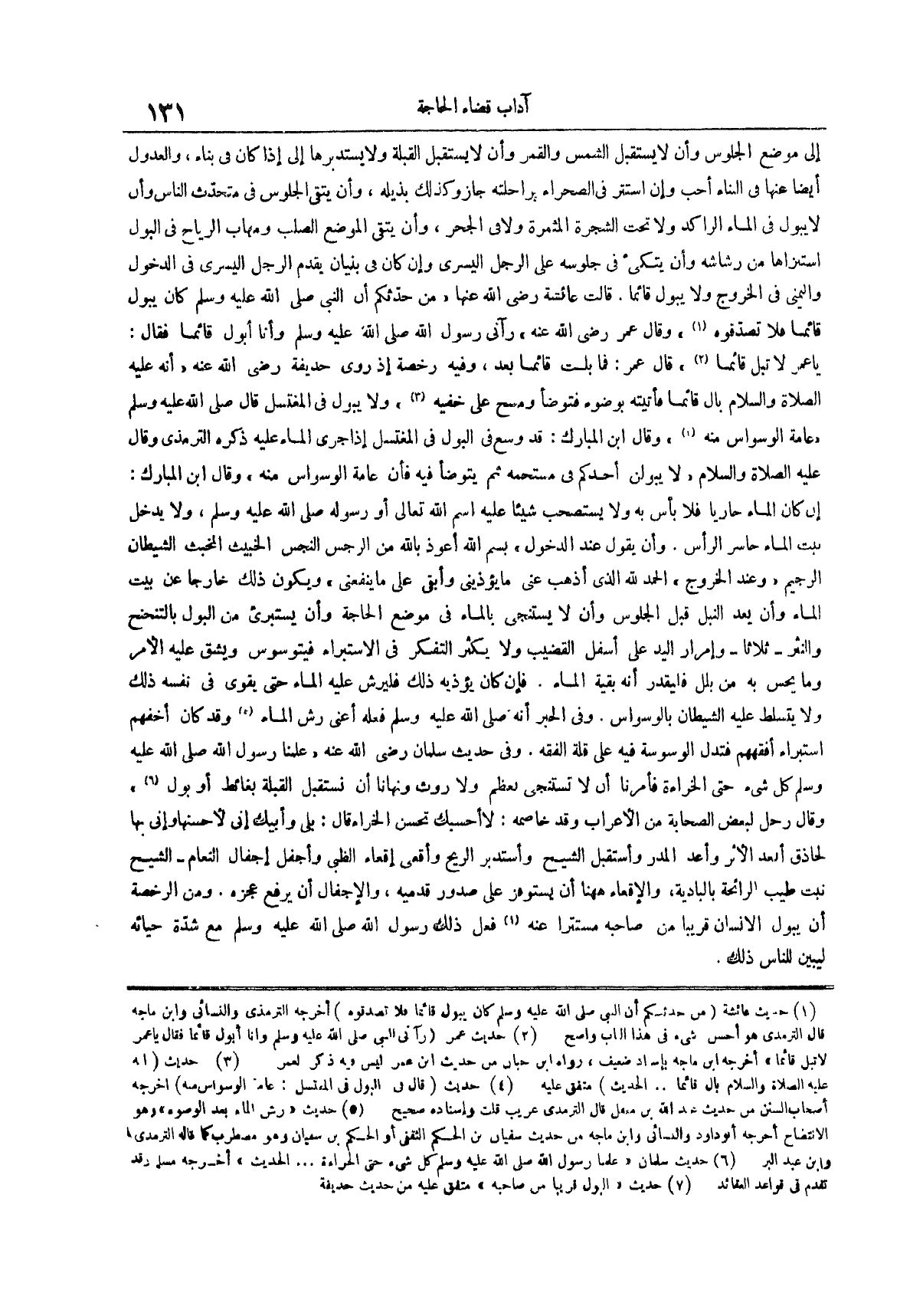 (¬1) حديث عائشة من حديثكم أن النبي صلى الله عليه وسلم كان يبول قائما فلا تصدقوه أخرجه الترمذي والنسائي وابن ماجه قال الترمذي هو أحسن شيء في هذا الباب وأصح