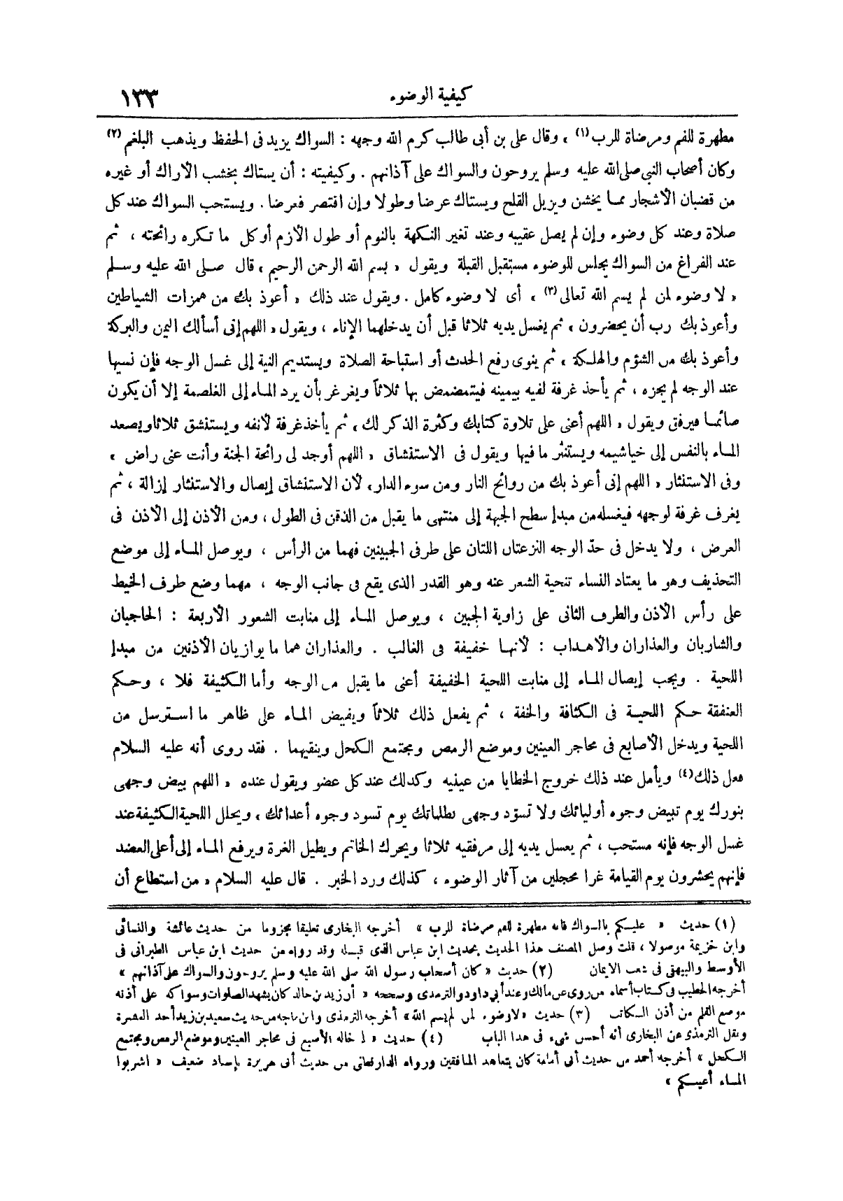 ويقول عند ذلك أعوذ بك من همزات الشياطين وأعوذ بك رب أن يحضرون ثم يغسل يديه ثلاثا قبل أن يدخلهما الإناء ويقول اللهم إني أسألك اليمن والبركة وأعوذ بك من الشؤم والهلكة ثم ينوي رفع الحدث أو استباحة الصلاة ويستديم النية إلى غسل الوجه فإن نسيها عند الوجه لم يجزه ثم يأخذ غرفة لفيه بيمينه فيتمضمض بها ثلاثاً ويغرغر بأن يرد الماء إلى الغلصمة إلا أن يكون صائماً فيرفق ويقول اللهم أعني على تلاوة كتابك وكثرة الذكر لك ثُمَّ يَأْخُذُ غُرْفَةً لِأَنْفِهِ وَيَسْتَنْشِقُ ثَلَاثًا وَيُصْعِدُ الْمَاءَ بِالنَّفَسِ إِلَى خَيَاشِيمِهِ وَيَسْتَنْثِرُ مَا فِيهَا ويقول في الاستنشاق اللهم أوجد لي رائحة الجنة وأنت عني راض وفي الاستنثار اللهم إني أعوذ بك من روائح النار ومن سوء الدار لأن الاستنشاق إيصال والاستنثار إزالة ثم يغرف غرفة لوجهه فيغسله من مبدإ سَطْحِ الْجَبْهَةِ إِلَى مُنْتَهَى مَا يُقْبِلُ مِنَ الذَّقَنِ فِي الطُّولِ وَمِنَ الْأُذُنِ إِلَى الْأُذُنِ في العرض ولا يدخل في حد الوجه النزعتان اللتان على طرفي الجبينين فهما من الرأس ويوصل الماء إلى موضع التحذيف وهو ما يعتاد النساء تنحية الشعر عنه وهو القدر الذي يقع في جانب الوجه مهما وضع طرف الخيط على رأس الأذن والطرف الثاني على زاوية الجبين ويوصل الماء إلى منابت الشعور الأربعة الحاجبان والشاربان والعذاران والأهداب لأنها خفيفة في الغالب