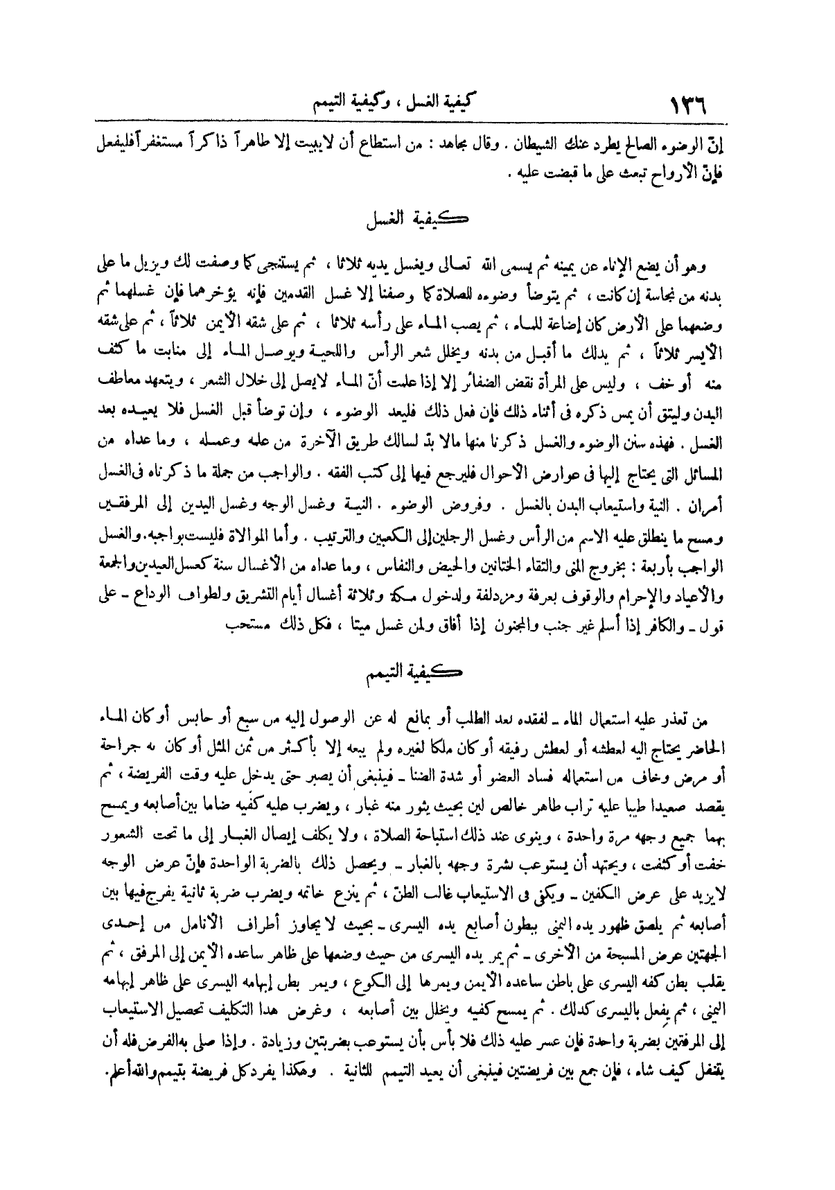 فهذه سنن الوضوء والغسل ذكرنا منها ما لا بد لسالك طريق الآخرة من علمه وعمله وما عداه من المسائل التي يحتاج إليها في عوارض الأحوال فليرجع فيها إلى كتب الفقه