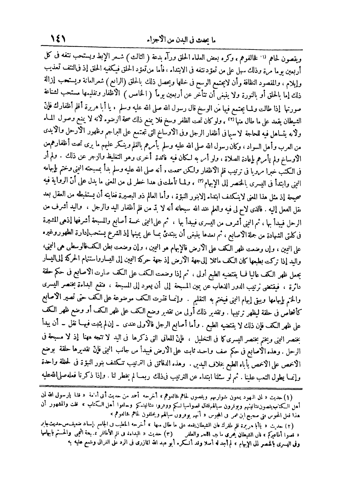 (¬3) حديث البداءة في قلم الأظافر بمسبحة اليمنى والختم بإبهامها وفي اليسرى بالخنصر إلى الإبهام لم أجد له أصلا وقد أنكره أبو عبد الله المازري في الرد على الغزالي وشنع عليه به