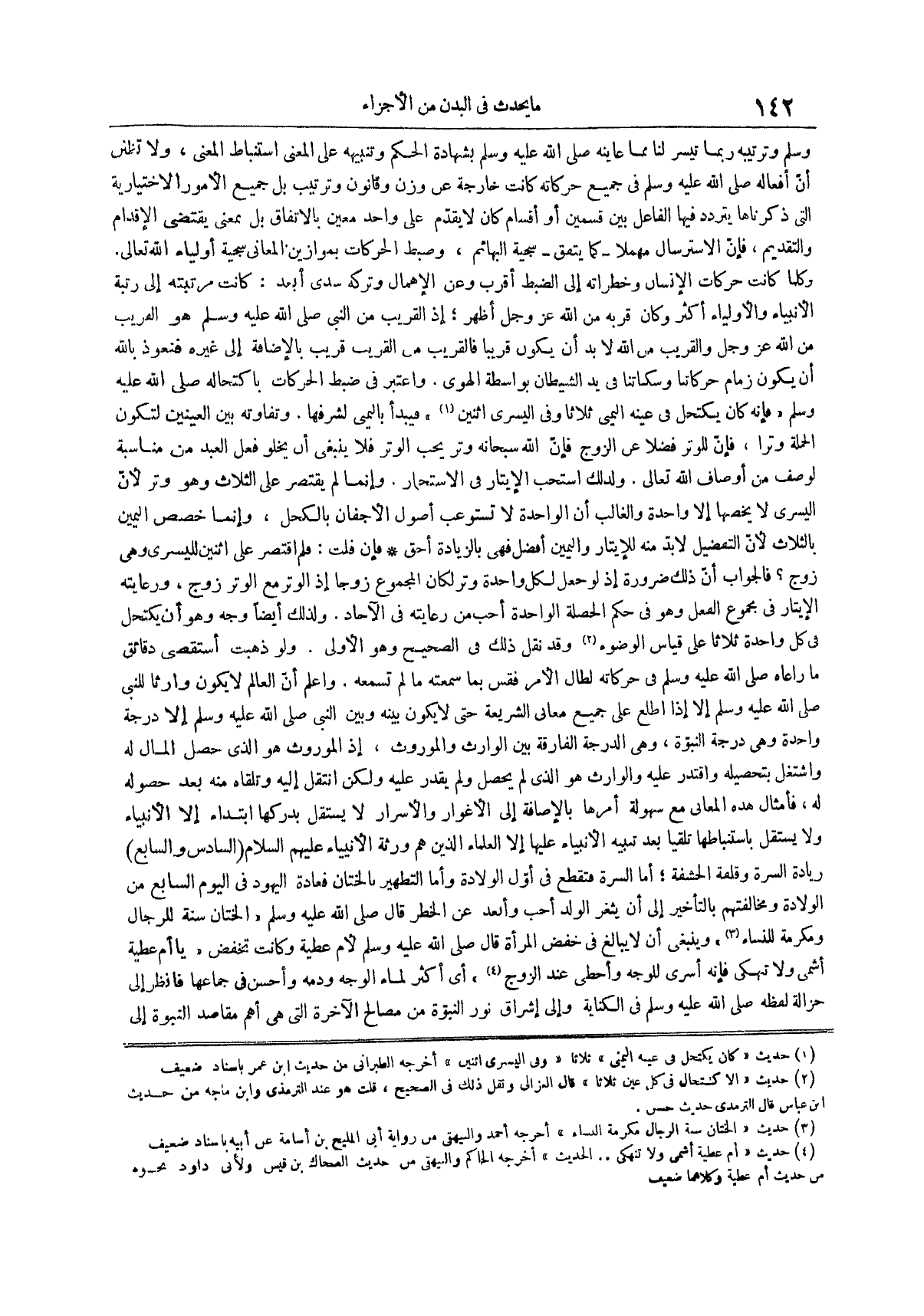 وترتيبه ربما تيسر لنا مما عاينه صلى الله عليه وسلم بشهادة الحكم وتنبيهه على المعنى استنباط المعنى ولا تظنن أن أفعاله صلى الله عليه وسلم في جميع حركاته كانت خارجة عن وزن وقانون وترتيب بل جميع الأمور الاختيارية التي ذكرناها يتردد فيها الفاعل بين قسمين أو أقسام كان لا يقدم على واحد معين بالاتفاق بل بمعنى يقتضي الإقدام والتقديم فإن الاسترسال مهملاً كما يتفق سجية البهائم وضبط الحركات بموازين المعاني سجية أولياء الله تعالى