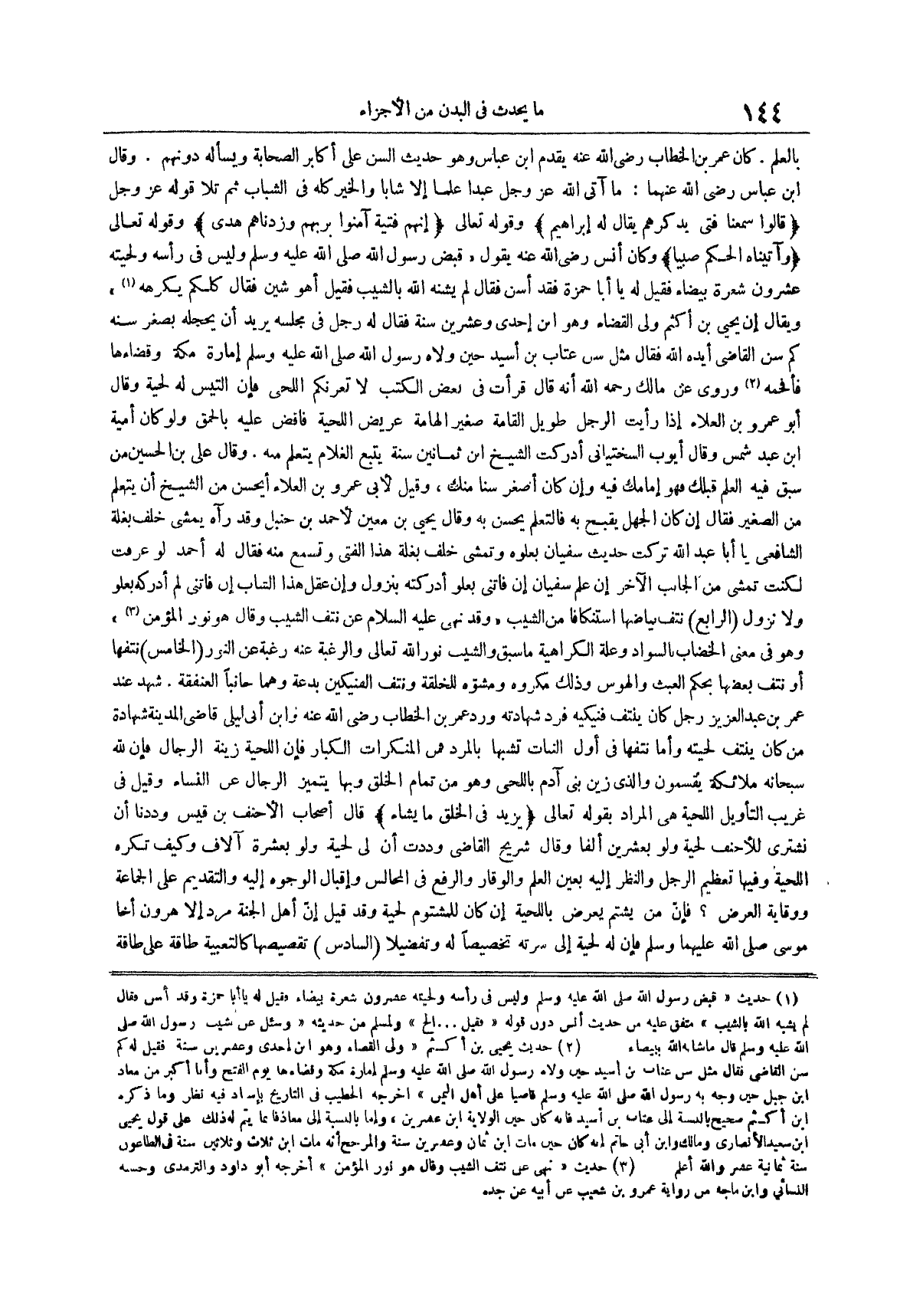 وَقَالَ ابْنُ عباس رضي الله عنهما ما آتى الله عز وجل عبداً عِلْمًا إِلَّا شَابًّا وَالْخَيْرُ كُلُّهُ فِي الشَّبَابِ ثُمَّ تَلَا قَوْلَهُ عَزَّ وَجَلَّ {قَالُوا سَمِعْنَا فتى يذكرهم يقال له إبراهيم} وَقَوْلَهُ تَعَالَى {إِنَّهُمْ فِتْيَةٌ آمَنُوا بِرَبِّهِمْ وَزِدْنَاهُمْ هدى} وقوله تعالى {وآتيناه الحكم صبياً} وكان أنس رضي الله عنه يقول قبض رسول الله صلى الله عليه وسلم وليس في رأسه ولحيته عشرون شعرة بيضاء فقيل له يا أبا حمزة فقد أسن فقال لم يشنه الله بالشيب فقيل أهو شين فقال كلكم يكرهه (¬1) ويقال إن يحيى بن أكثم ولي القضاء وهو ابن إحدى وعشرين سنة فقال له رجل في مجلسه يريد أن يخجله بصغر سنه كم سن القاضي أيده الله فقال مثل سن عتاب بن أسيد حين ولاه رسول الله صلى الله عليه وسلم إمارة مكة وقضاءها فأفحمه (¬2) وروي عن مالك رحمه الله أنه قال قرأت في بعض الكتب لا تغرنكم اللحى فإن التيس له لحية وقال أبو عمرو بن العلاء إذا رأيت الرجل طويل القامة صغير الهامة عريض اللحية فاقض عليه بالحمق ولو كان أمية بن عبد شمس وَقَالَ أَيُّوبُ السِّخْتِيَانِيُّ أَدْرَكْتُ الشَّيْخَ ابْنَ ثَمَانِينَ سنة يتبع الغلام يتعلم منه