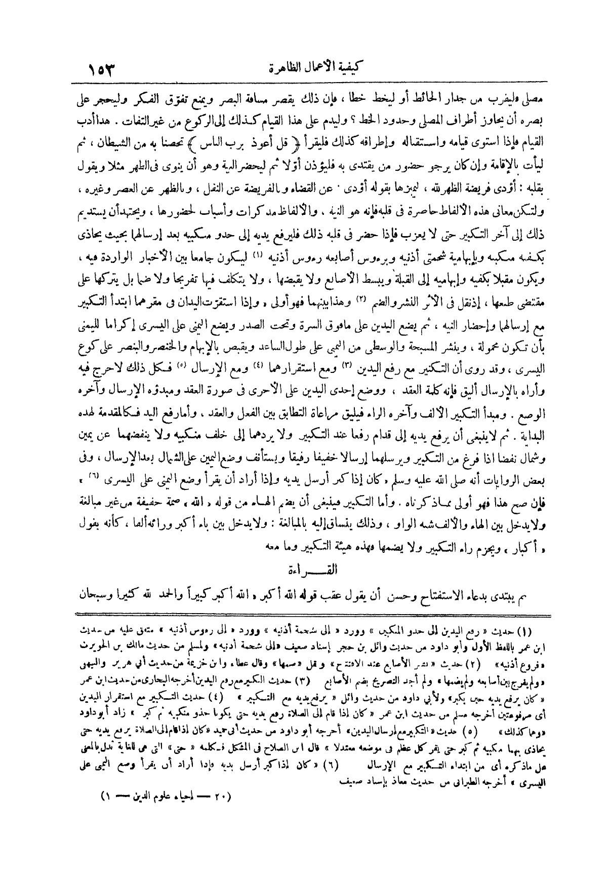(¬5) حديث التكبير مع إرسال اليدين أخرجه أبو داود من حديث أبي حميد كان إذا قام إلى الصلاة يرفع يديه حتى يحاذي بهما منكبيه ثم كبر حتى يقر كل عظم في موضعه معتدلا قال ابن الصلاح في المشكل فكلمة حتى التي هي للغاية تدل بالمعنى على ما ذكره أي من ابتداء التكبير مع الإرسال