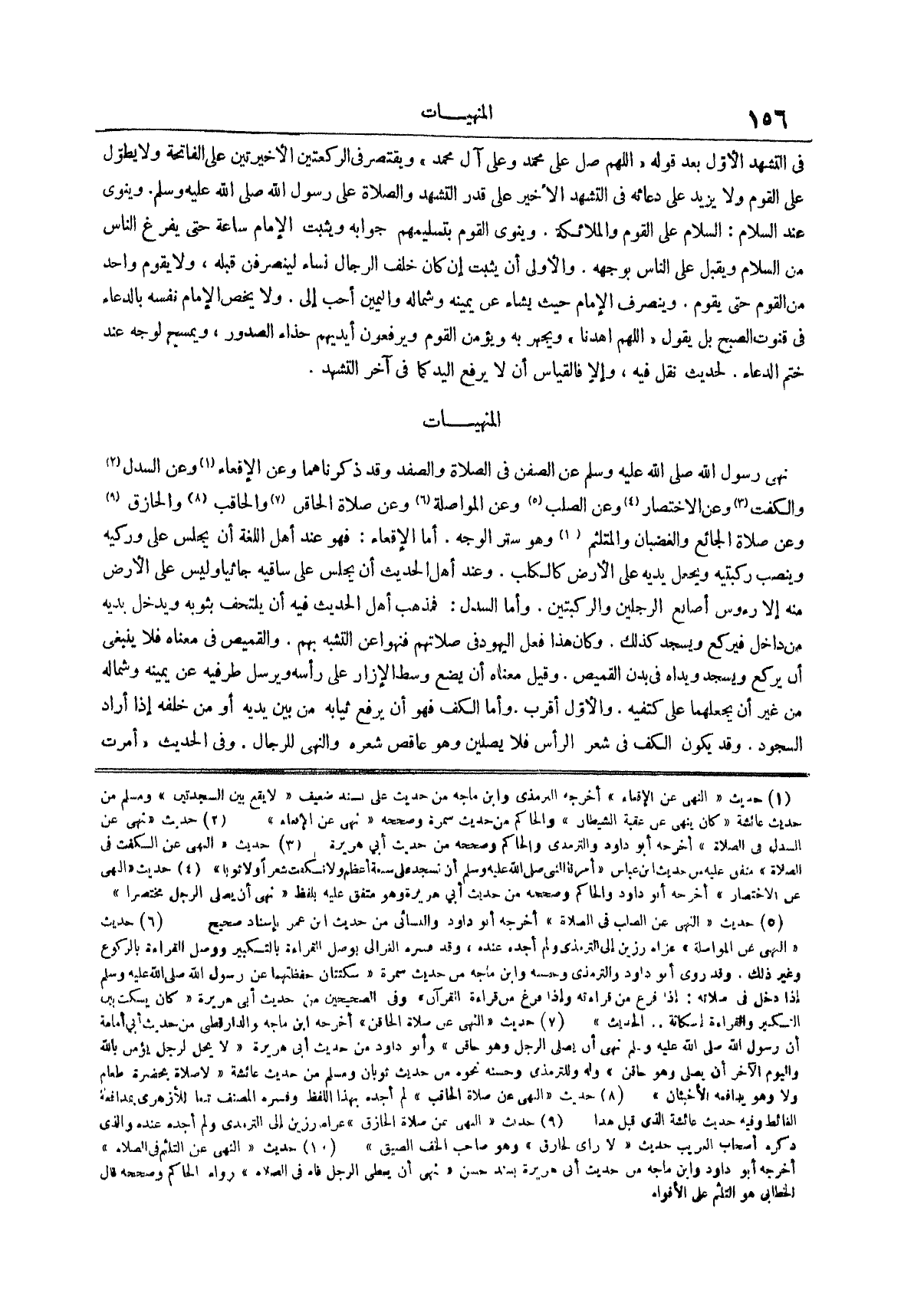 (¬10) حديث النهي عن التلثم في الصلاة أخرجه أبو داود وابن ماجه من حديث أبي هريرة بسند حسن نهى أن يغطي الرجل فاه في الصلاة رواه الحاكم وصححه وقال الخطابي هو التلثم على الأفواه