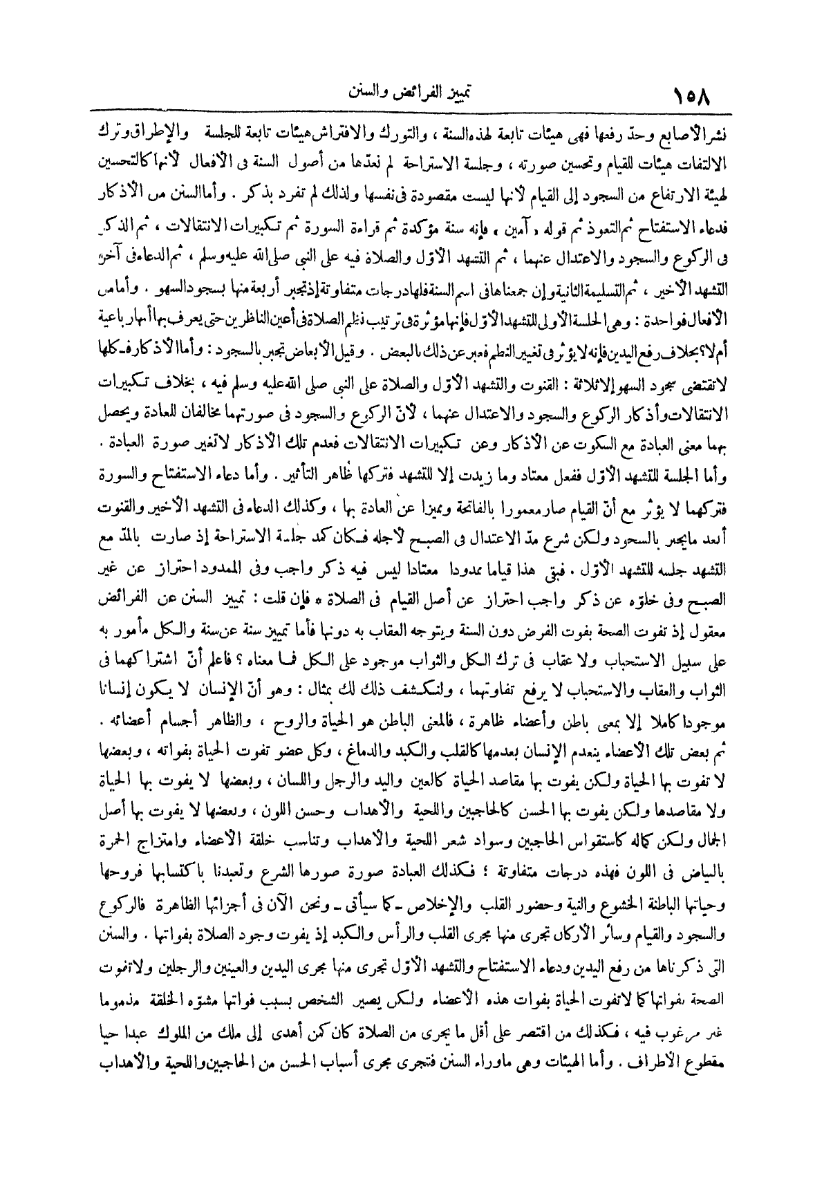 نشر الأصابع وحد رفعها فهي هيئات تابعة لهذه السنة والتورك والافتراش هيئات تابعة للجلسة والإطراق وترك الالتفات هيئات للقيام وتحسين صورته وجلسة الاستراحة لم نعدها من أصول السنة في الأفعال لأنها كالتحسين لهيئة الارتفاع من السجود إلى القيام لأنها ليست مقصودة في نفسها ولذلك لم تفرد بذكر