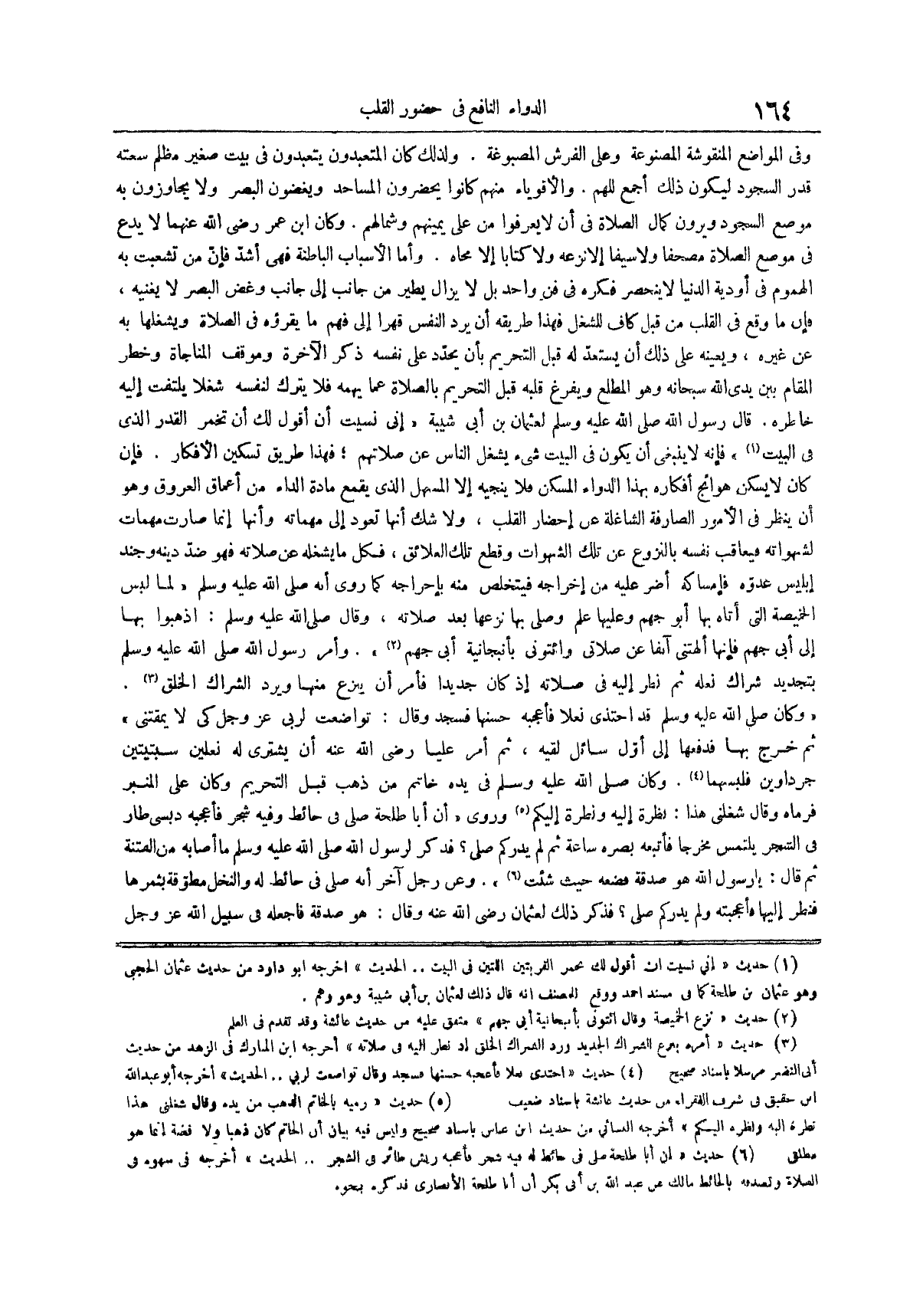 قَالَ رَسُولُ اللَّهِ صَلَّى اللَّهُ عَلَيْهِ وَسَلَّمَ لعثمان بن أبي شيبة إني نسيت أن أقول لك أن تخمر القدر الذي في البيت (¬1) فإنه لا ينبغي أن يكون في البيت شيء يشغل الناس عن صلاتهم فهذا طريق تسكين الأفكار