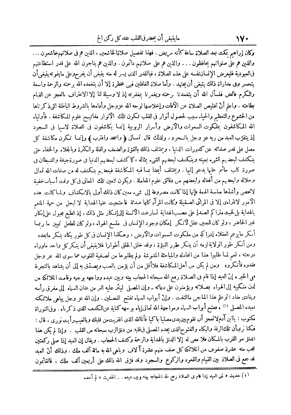 واعلم ان تخليص الصلاة عن الآفات وإخلاصها لوجه الله عز وجل وأداءها بالشروط الباطنة التي ذكرناها من الخشوع والتعظيم والحياء سبب لحصول أنوار في القلب تكون تلك الأنوار مفاتيح علوم المكاشفة