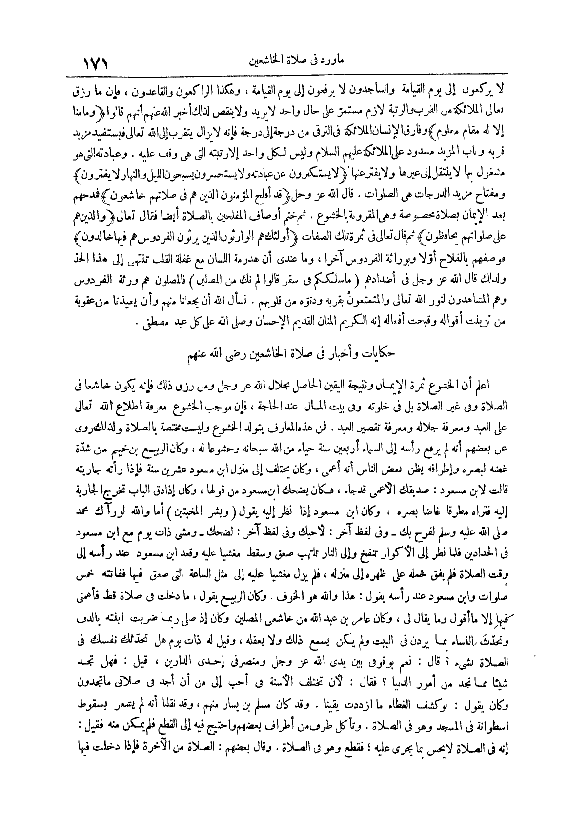 وكان الربيع يقول ما دخلت في صلاة قط فأهمني فيها إلا ما أقول وما يقال لي وكان عامر بن عبد الله من خاشعي المصلين وكان إذا صلى ربما ضربت ابنته بالدف وتحدث النساء بما يردن في البيت ولم يكن يسمع ذلك ولا يعقله وقيل له ذات يوم هل تحدثك نفسك في الصلاة بشيء قال نعم بوقوفي بين يدي الله عز وجل ومنصرفي إحدى الدارين قيل فهل تجد شيئاً مما نجد من أمور الدنيا فقال لأن تختلف الأسنة في أحب إلي من أن أجد في صلاتي ما تجدون وكان يقول لو كشف الغطاء ما ازددت يقيناً