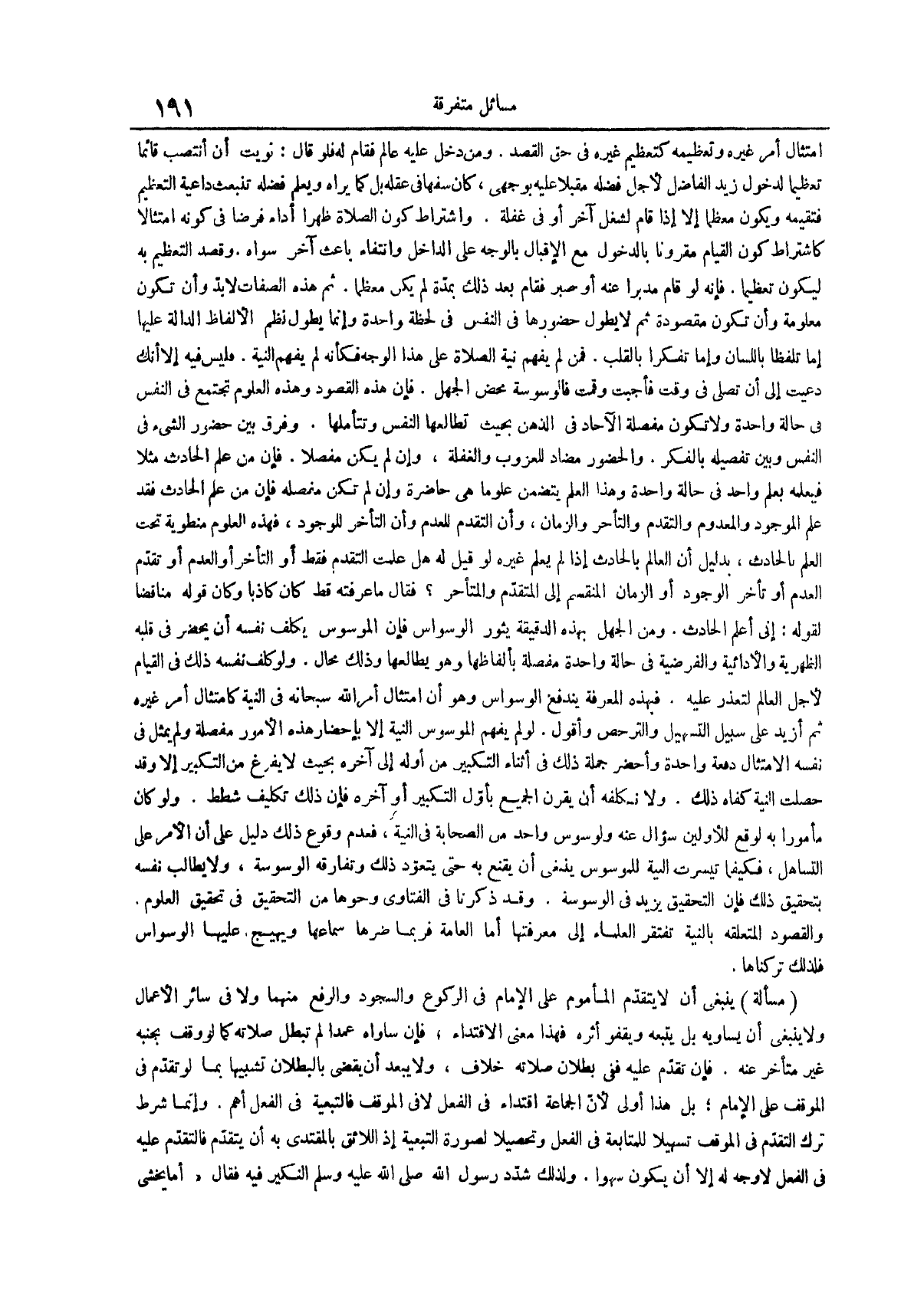 ومن الجهل بهذه الدقيقة يثور الوسواس فإن الموسوس يكلف نفسه أن يحضر في قلبه الظهرية والأدائية والفرضية في حالة واحدة مفصلة بألفاظها وهو يطالعها وذلك محال