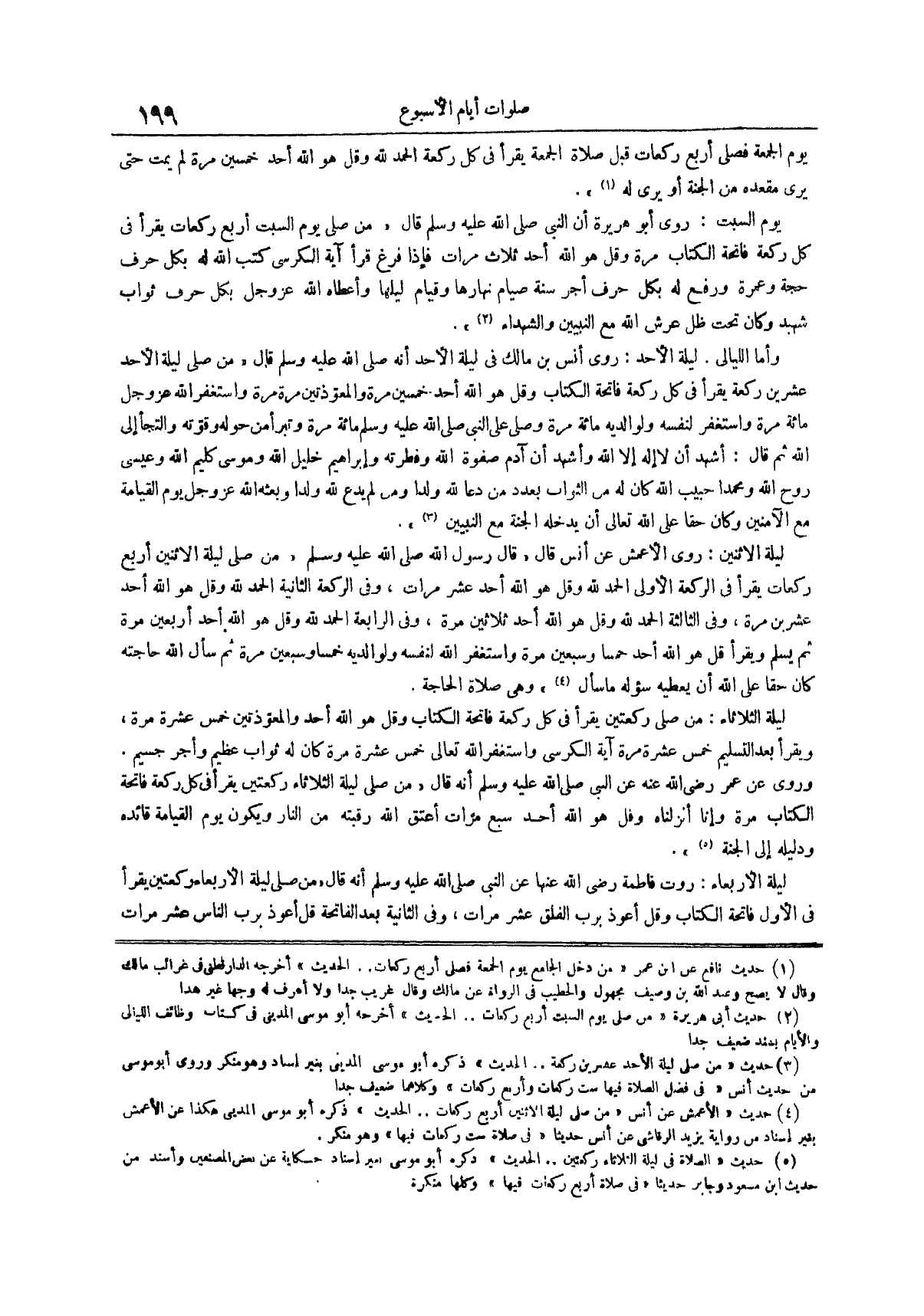 يوم السبت روى أبو هريرة أن النبي صلى الله عليه وسلم قال من صلى يوم السبت أربع ركعات يقرأ في كل ركعة فاتحة الكتاب مرة وقل هو الله أحد ثلاث مرات فإذا فرغ قرأ آية الكرسي كتب الله له بكل حرف حجة وعمرة ورفع له بكل حرف أجر سنة صيام نهارها وقيام ليلها وأعطاه الله عز وجل بكل حرف ثواب شهيد وكان تحت ظل عرش الله مع النبيين والشهداء (¬2)