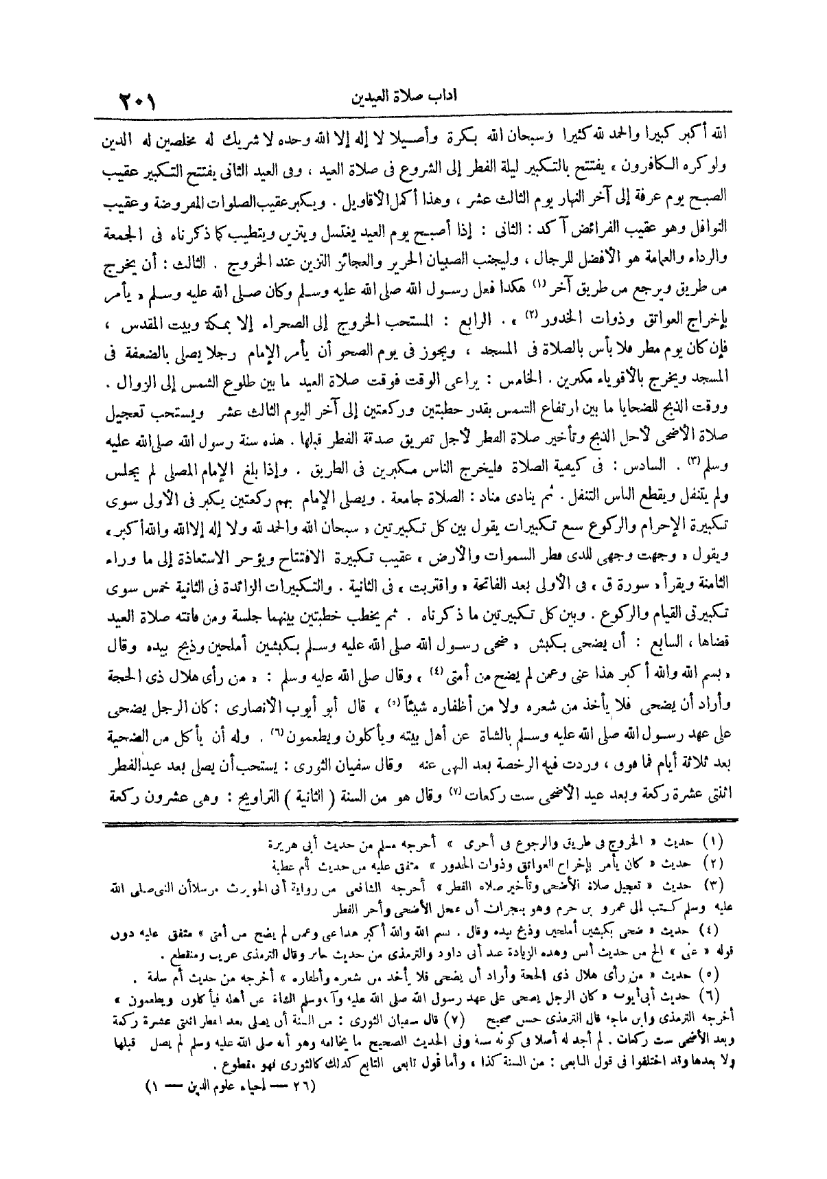 (¬7) قال سفيان الثوري من السنة أن يصلي بعد الفطر اثنتي عشرة ركعة وبعد الأضحى ست ركعات لم أجد له أصلا في كونه سنة وفي الحديث الصحيح ما يخالفه وهو أنه صلى الله عليه وسلم لم يصل قبلها ولا بعدها وقد اختلفوا في قول التابعي من السنة كذا وأما قول تابعي التابع كذلك كالثوري فهو مقطوع