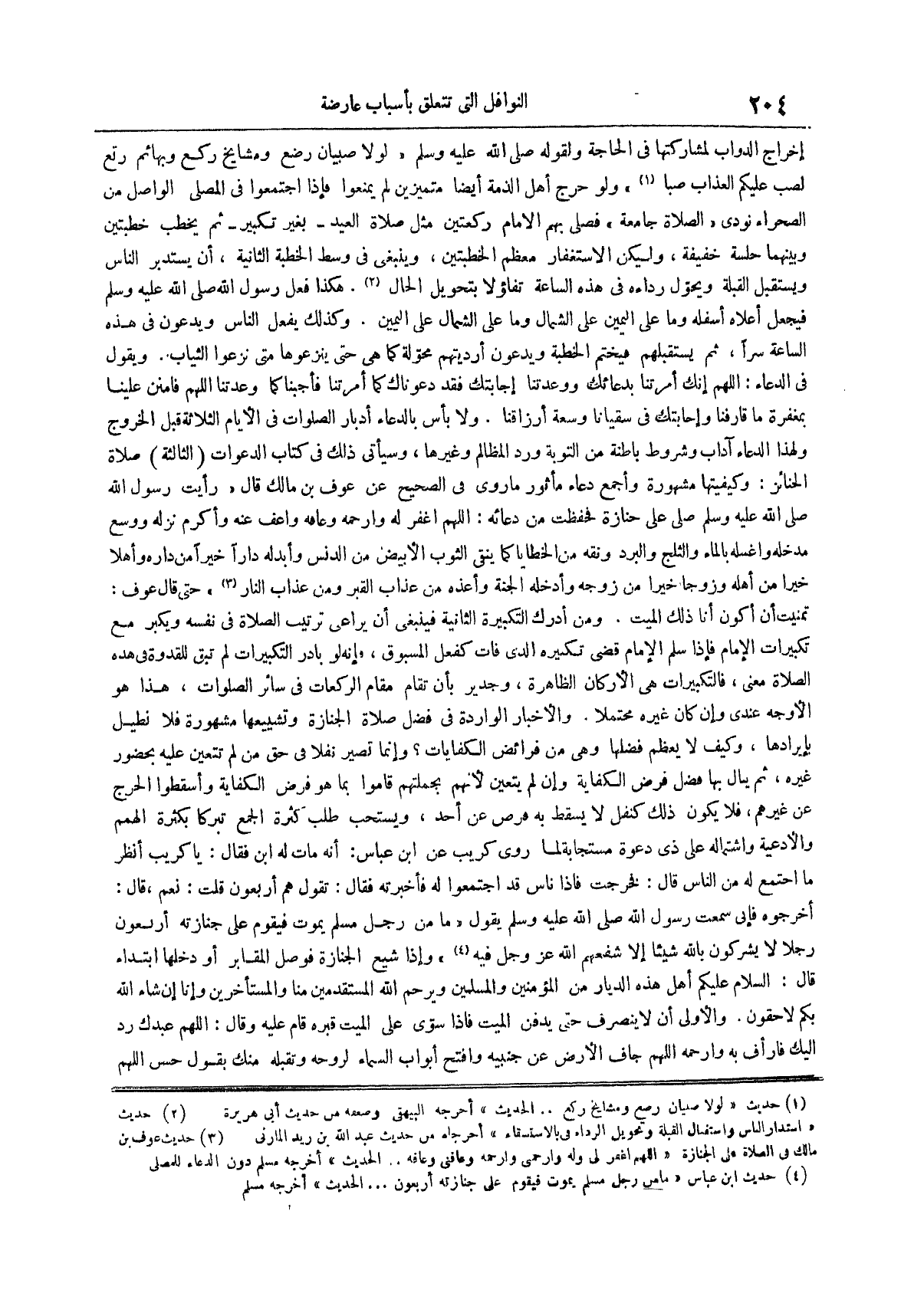 والأخبار الواردة في فضل صلاة الجنازة وتشييعها مشهورة فلا نطيل بإيرادها وكيف لا يعظم فضلها وَهِيَ مِنْ فَرَائِضِ الْكِفَايَاتِ وَإِنَّمَا تَصِيرُ نَفْلًا فِي حَقِّ مَنْ لَمْ تَتَعَيَّنْ عَلَيْهِ بِحُضُورِ غيره ثم ينال بها فضل فرض الكفاية وإن لم يتعين لأنهم بجملتهم قاموا بما هو فرض الكفاية وأسقطوا الحرج عن غيرهم فلا يكون ذلك كنفل لا يسقط به فرض عن أحد ويستحب طلب كثرة الجمع تبركاً بكثرة الهمم والأدعية واشتماله على ذي دعوة مستجابة لما روى كريب عن ابن عباس أنه مات له ابن فقال يا كريب انظر ما اجتمع له من الناس قال فخرجت فإذا ناس قد اجتمعوا له فأخبرته فقال تقول هم أربعون قلت نعم قال أخرجوه فإني سَمِعْتُ رَسُولَ اللَّهِ صَلَّى اللَّهُ عَلَيْهِ وَسَلَّمَ يقول ما من رجل مسلم يموت فيقوم على جنازته أربعون رجلاً لا يشركون بالله شيئاً إلا شفعهم الله عز وجل فيه (¬4) وإذا شيع الجنازة فوصل المقابر أو دخلها ابتداء قال السلام عليكم أهل هذه الديار من المؤمنين والمسلمين ويرحم الله المستقدمين منا والمستأخرين وإنا إن شاء الله بكم لاحقون