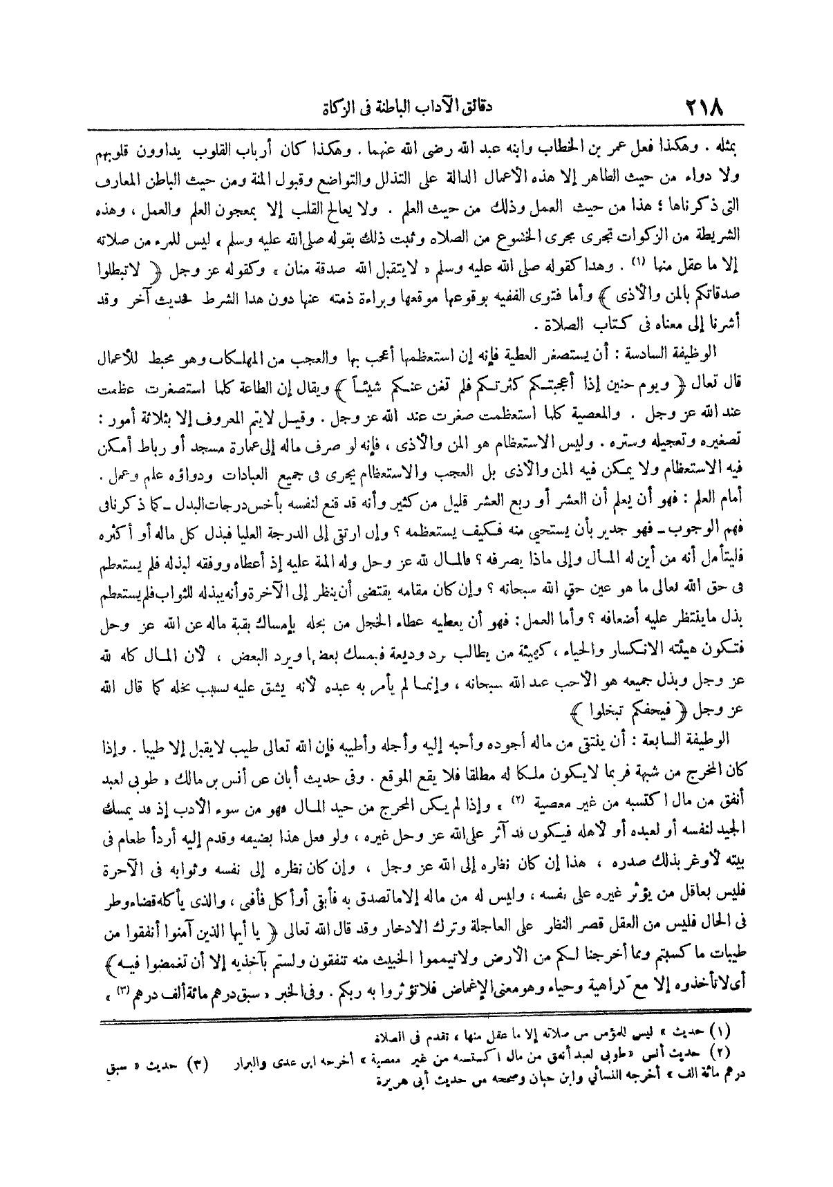 الوظيفة السَّادِسَةُ أَنْ يَسْتَصْغِرَ الْعَطِيَّةَ فَإِنَّهُ إِنِ اسْتَعْظَمَهَا أُعْجِبَ بِهَا وَالْعُجْبُ مِنَ الْمُهْلِكَاتِ وَهُوَ مُحْبِطٌ للأعمال قال تعالى ويوم حنين إذا أعجبتكم كثرتكم فلم تغن عنكم شيئاً ويقال إن الطاعة كلما استصغرت عظمت عند الله عز وجل