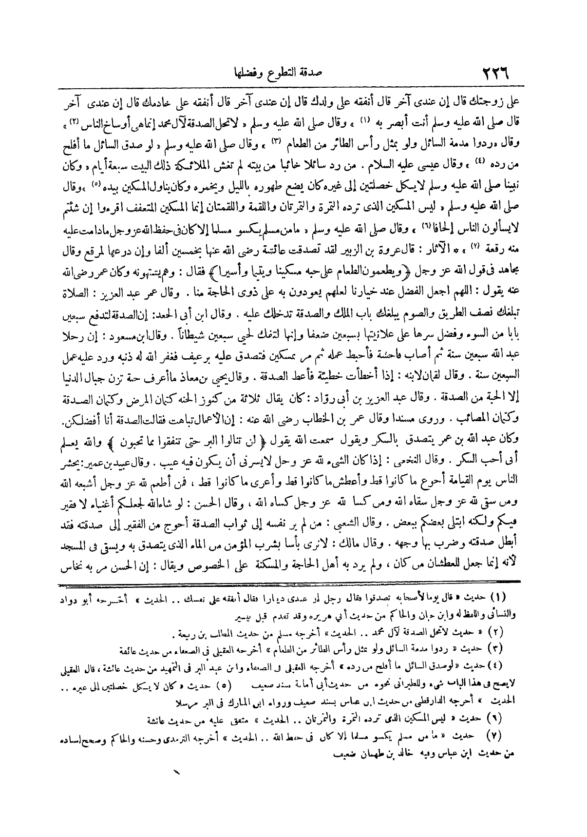 على زوجتك قال إن عندي آخر قال أنفقه على ولدك قال إن عندي آخر قال أنفقه على خادمك قال إن عندي آخر قال صلى الله عليه وسلم أنت أبصربه (¬1) وقال صلى الله عليه وسلم لا تحل الصدقة لآل محمد إنما هي أوساخ الناس (¬2) وقال ردوا مذمة السائل ولو بمثل رأس الطائر من الطعام (¬3) وقال صلى الله عليه وسلم لو صدق السائل ما أفلح من رده (¬4) وقال عيسى عليه السلام