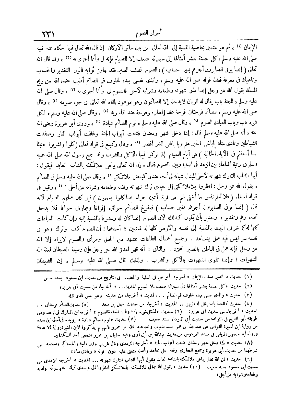 {الإيمان} (¬1) ثم هو متميز بخاصية النسبة إلى الله تعالى من بين سائر الأركان إذ قال الله تعالى فيما حكاه عنه نبيه صلى الله عليه وسلم كل حسنة بعشر أمثالها إلى سبعمائة ضعف إلا الصيام فإنه لي وأنا أجزي به (¬2) وقد قال الله تَعَالَى {إِنَّمَا يُوَفَّى الصَّابِرُونَ أَجْرَهُمْ بِغَيْرِ حِسَابٍ} والصوم نصف الصبر فقد جاوز ثوابه قَانُونَ التَّقْدِيرِ وَالْحِسَابِ وَنَاهِيكَ فِي مَعْرِفَةِ فَضْلِهِ قَوْلُهُ صَلَّى اللَّهُ عَلَيْهِ وَسَلَّمَ وَالَّذِي نَفْسِي بِيَدِهِ لِخُلُوفِ فَمِ الصَّائِمِ أَطْيَبُ عِنْدَ اللَّهِ مِنْ رِيحِ الْمِسْكِ يَقُولُ اللَّهُ عَزَّ وَجَلَّ إنما يذر شهوته وطعامه وشرابه لأجلي فالصوم لي وأنا أجزي به (¬3) وقال صلى الله عليه وسلم للجنة باب يقال له الريال لا يدخله إلا الصائمون وهو موعود بلقاء الله تعالى في جزء صومه (¬4) وقال صَلَّى اللَّهُ عَلَيْهِ وَسَلَّمَ لِلصَّائِمِ فَرْحَتَانِ فَرْحَةٌ عند إفطاره وفرحة عند لقاء ربه (¬5) وقال صلى الله عليه وسلم لكل شيء باب وباب العبادة الصوم (¬6) وقال صلى الله عليه وسلم نوم الصائم عبادة (¬7) وروي أبو هريرة رضي الله عنه أنه صلى الله عليه وسلم قال إذا دخل شهر رمضان فتحت أبواب الجنة وغلقت أبواب النار وصفدت الشياطين ونادى مناد يا باغي الخير هلم ويا باغي الشر أقصر (¬8) وقال وكيع في قوله تعالى {كلوا واشربوا هنيئاً بما أسلفتم في الأيام الخالية} هي أيام الصيام إذ تركوا فيها الأكل والشرب وقد جمع رسول الله صلى الله عليه وسلم في رتبة المباهاة بين الزهد في الدنيا وبين الصوم فقال إن الله تعالى يباهي ملائكته بالشاب العابد فيقول أيها الشاب التارك شهوته لأجلي المبذل شبابه لي أنت عندي كبعض ملائكتي (¬9) وقال صلى الله عليه وسلم في الصائم يقول الله عز وجل انظروا يا ملائكتي إلى عبدي ترك شهوته ولذته وطعامه وشرابه من أجلي (¬10) وَقِيلَ فِي قَوْلِهِ تَعَالَى {فَلَا تَعْلَمُ نَفْسٌ مَا أُخْفِيَ لَهُمْ مِنْ قُرَّةِ أَعْيُنٍ جَزَاءً بما كانوا يعملون} قيل كَانَ عَمَلُهُمُ الصِّيَامَ لِأَنَّهُ قَالَ {إِنَّمَا يُوَفَّى الصابرون أجرهم بغير حساب} فَيُفْرَغُ لِلصَّائِمِ جَزَاؤُهُ إِفْرَاغًا وَيُجَازَفُ جُزَافًا فَلَا يَدْخُلُ تَحْتَ وَهْمٍ وَتَقْدِيرٍ وَجَدِيرٌ بِأَنْ يَكُونَ كَذَلِكَ لِأَنَّ الصَّوْمَ إِنَّمَا كَانَ لَهُ وَمُشَرِّفًا بِالنِّسْبَةِ إِلَيْهِ وَإِنْ كَانَتِ الْعِبَادَاتُ كُلُّهَا لَهُ كما شرف البيت بالنسبة إلى نفسه والأرض كُلُّهَا لَهُ لِمَعْنَيَيْنِ